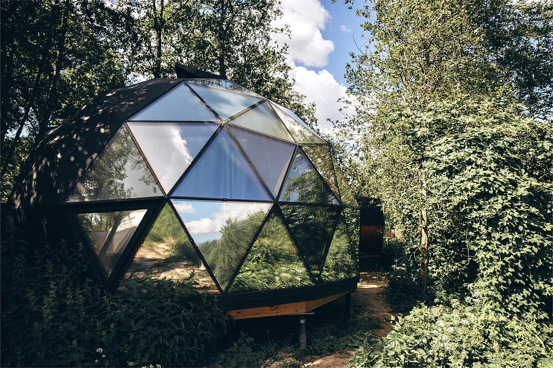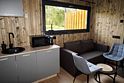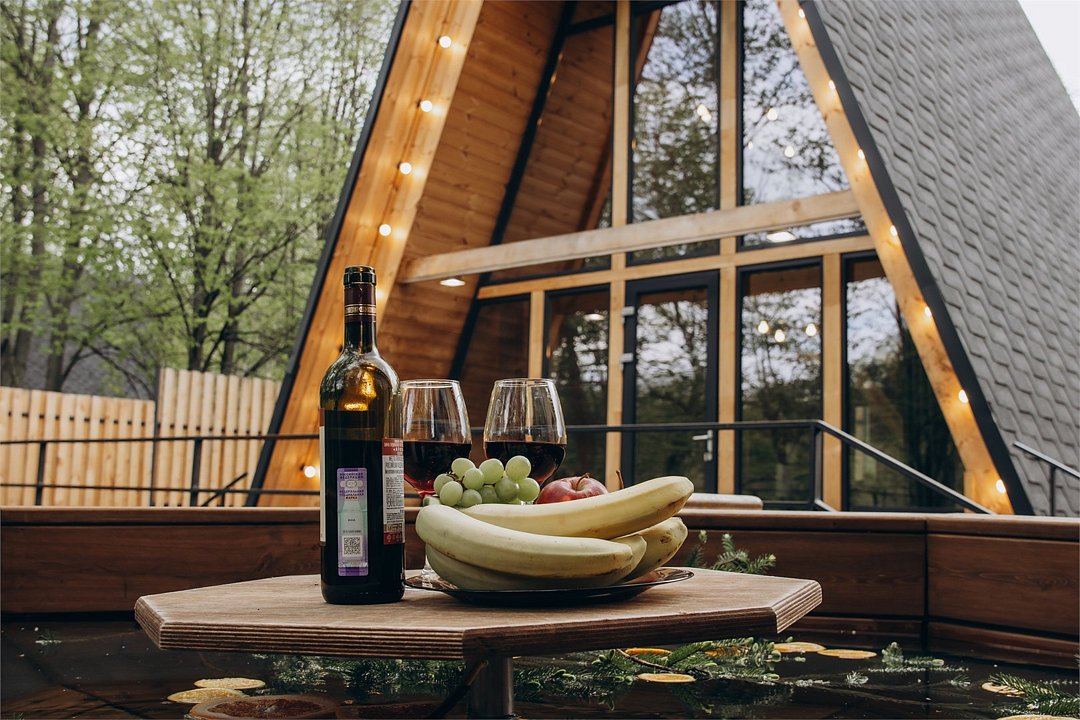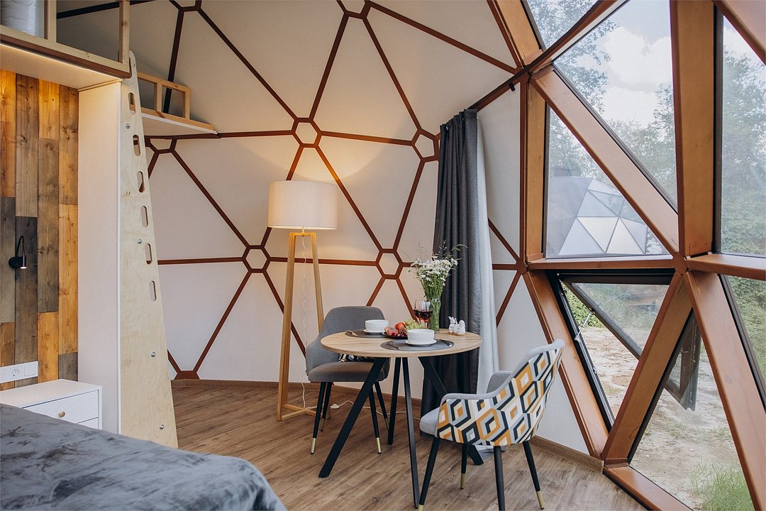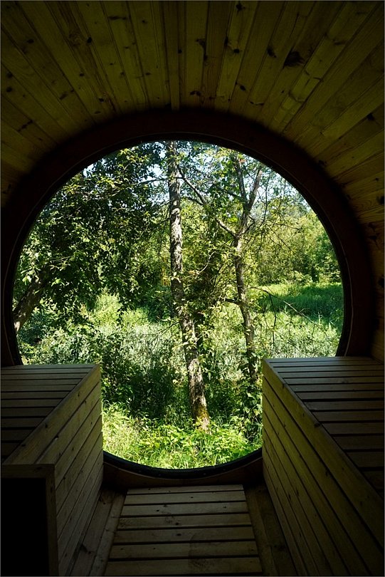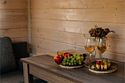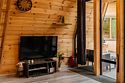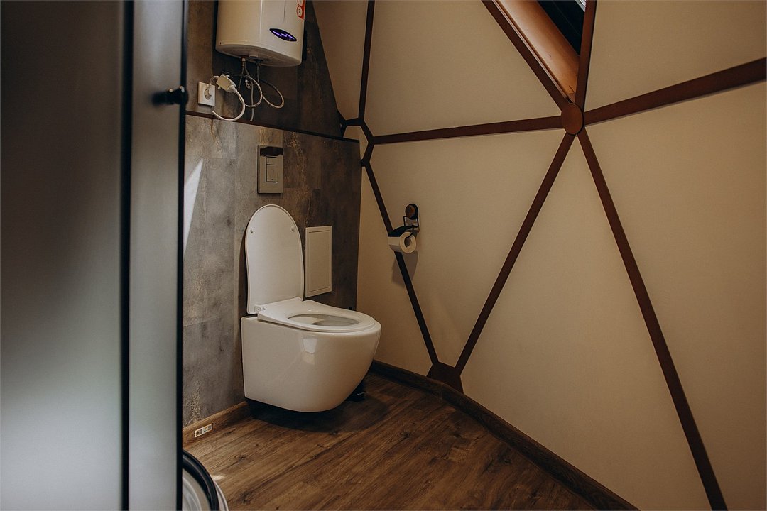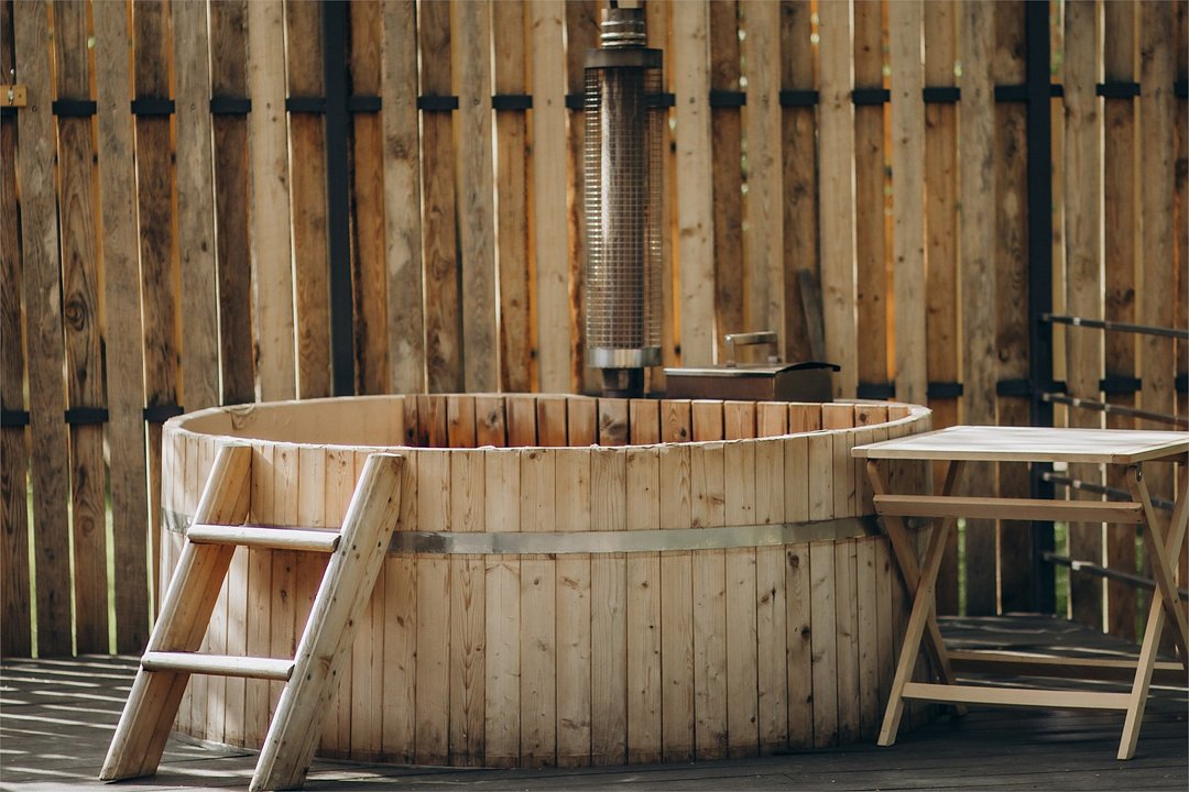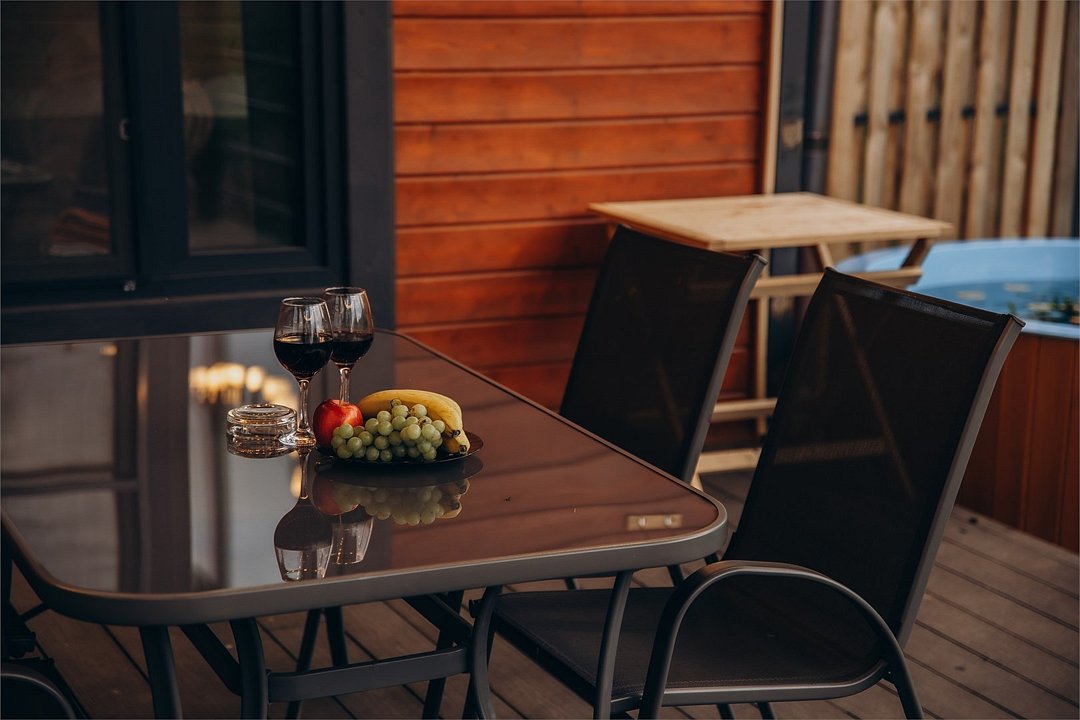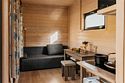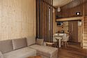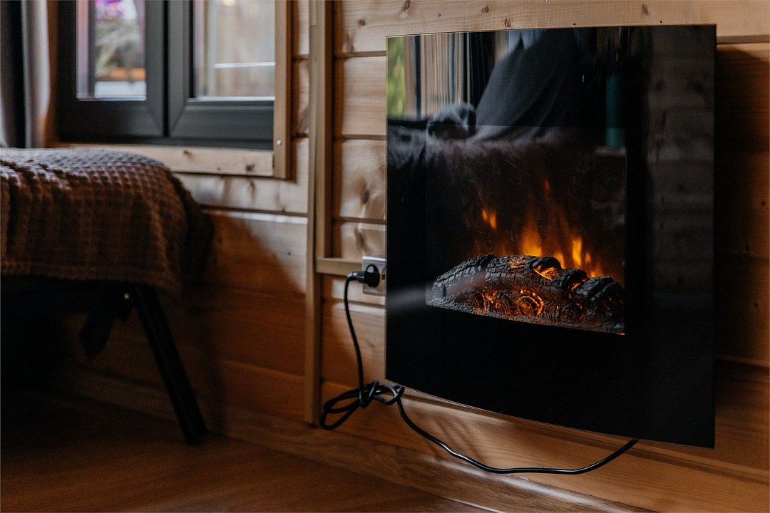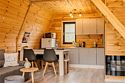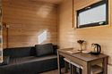 Одноэтажный домик площадью 29 м² с террасой и панорамными окнами (вид на реку). Есть все удобства и зона барбекю. В домике установлен электрический камин. На террасе у домика расположены гриль барбекю, мангал и садовая мебель. У каждого домика есть отдельная купель.Услуги и удобства