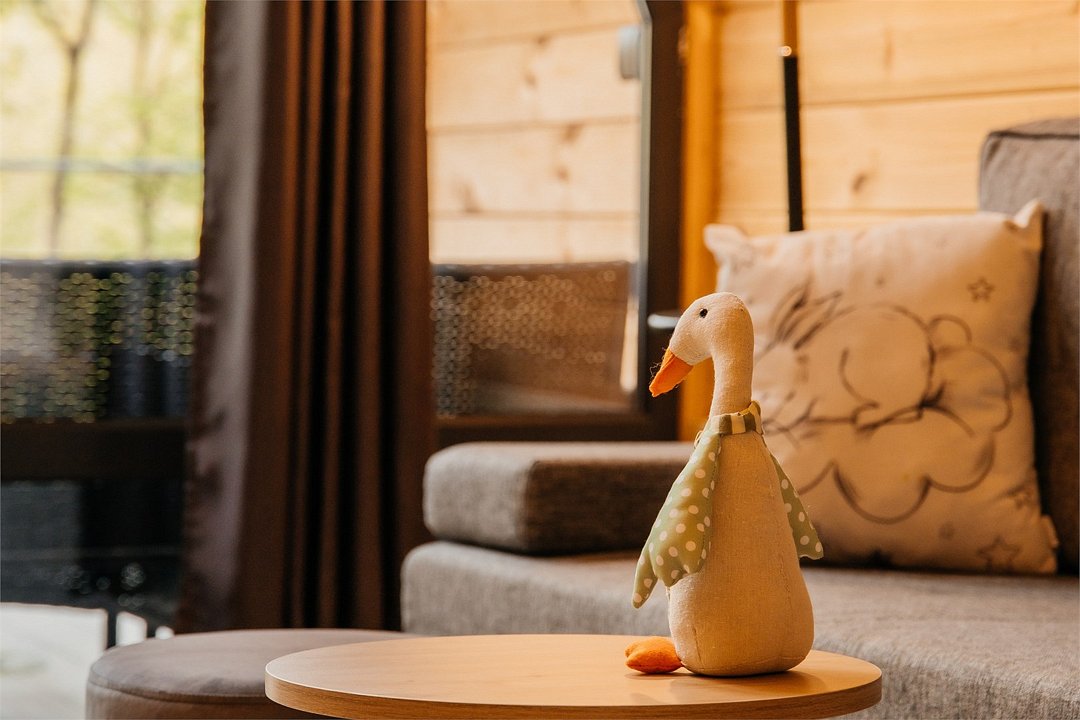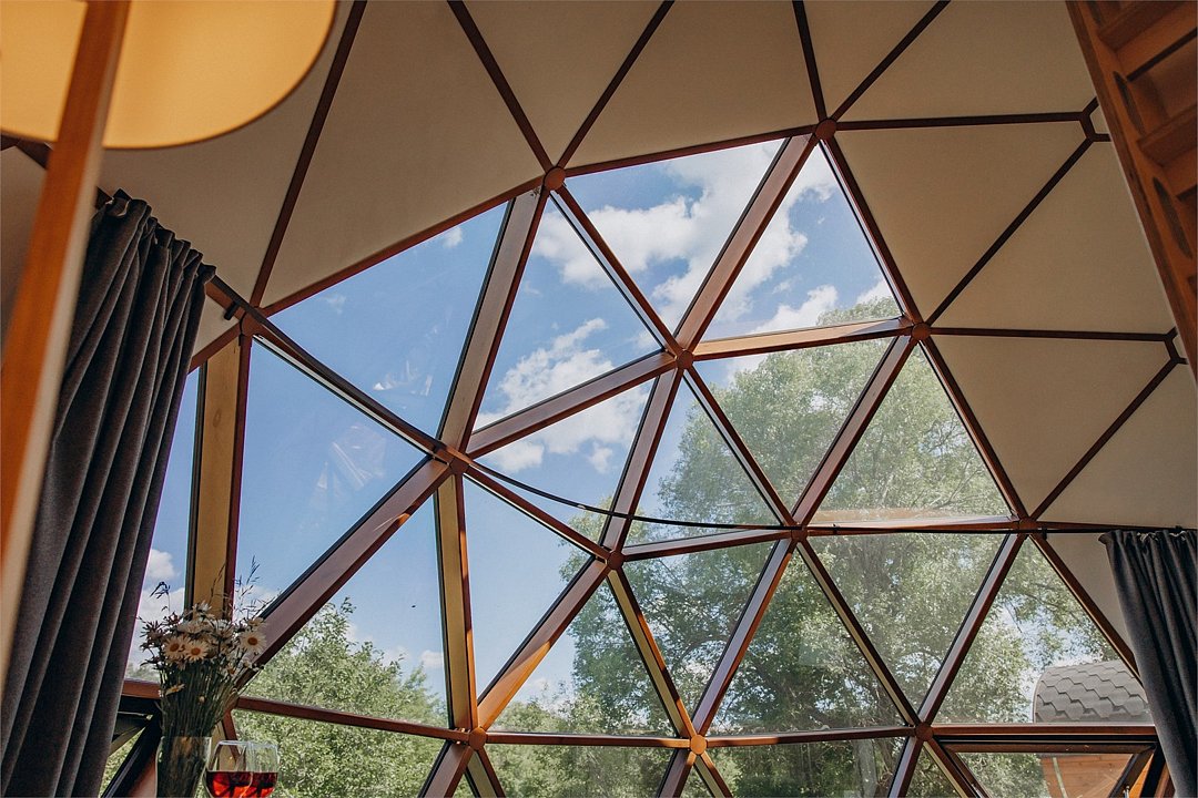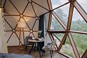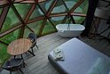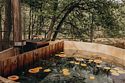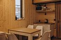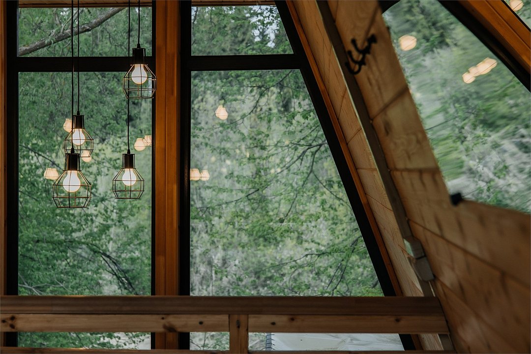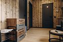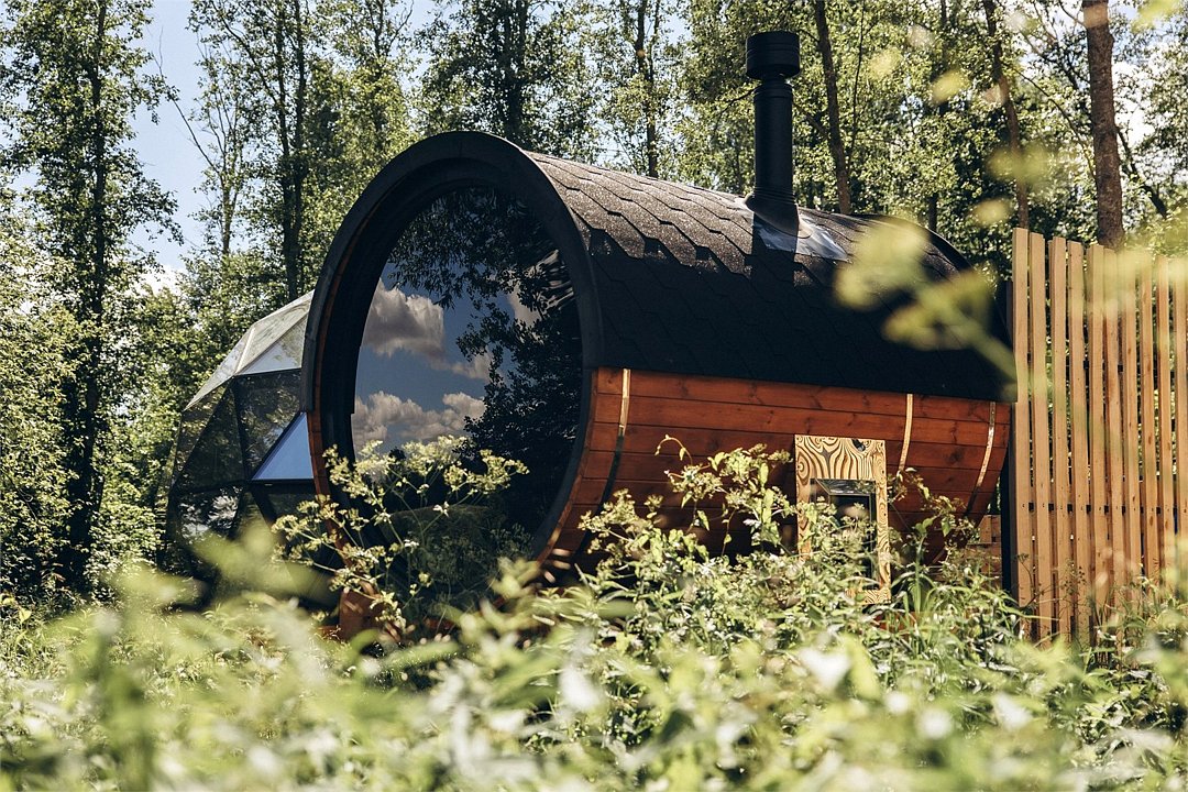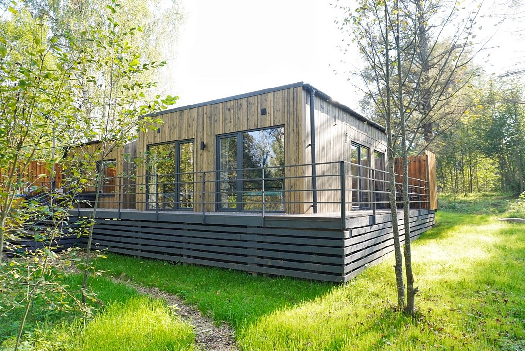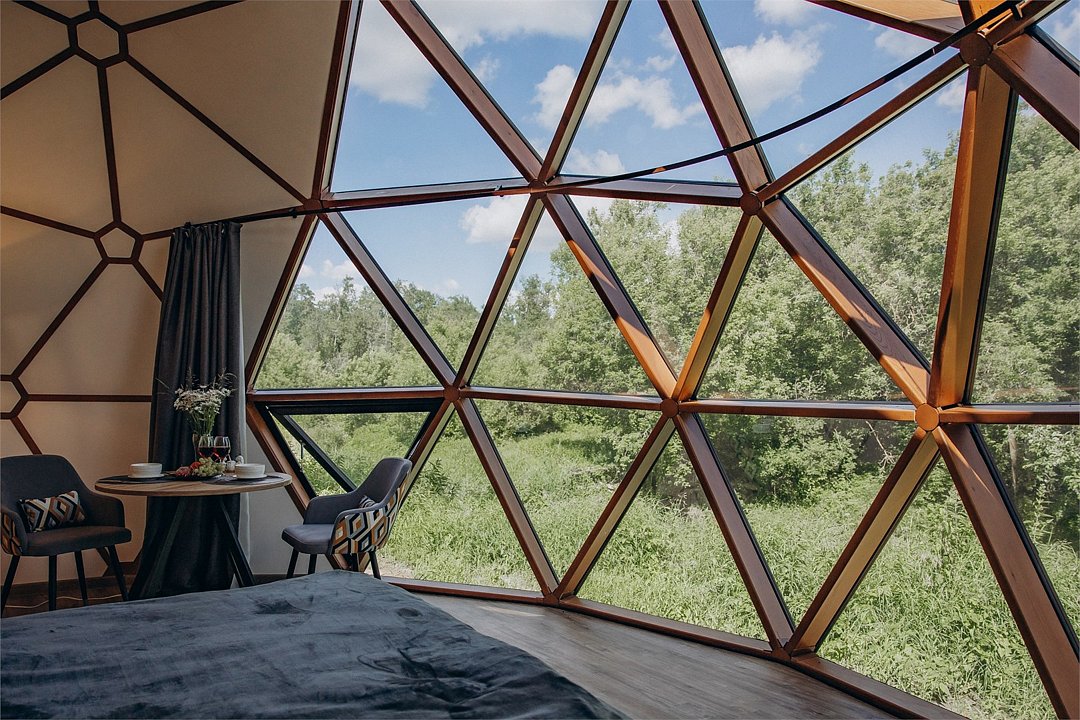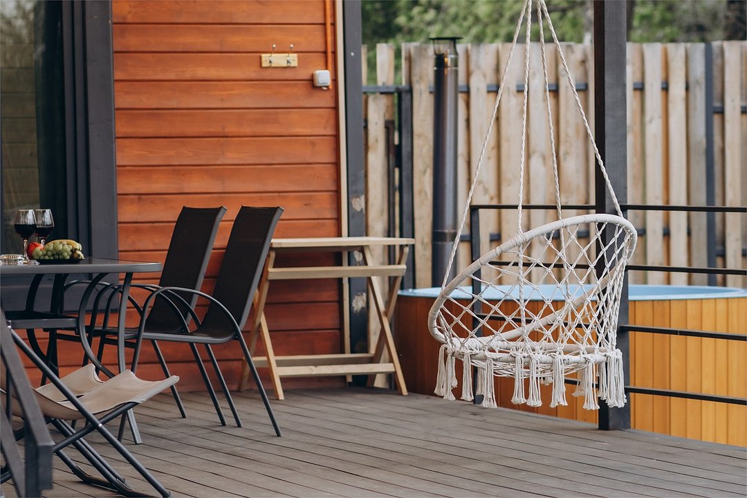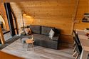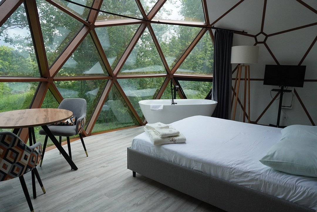 Одноэтажный домик площадью 29 м² с террасой и панорамными окнами (вид на реку). Есть все удобства и зона барбекю. В домике установлен электрический камин. На террасе у домика расположены гриль барбекю, мангал и садовая мебель. У каждого домика есть отдельная купель.Услуги и удобства