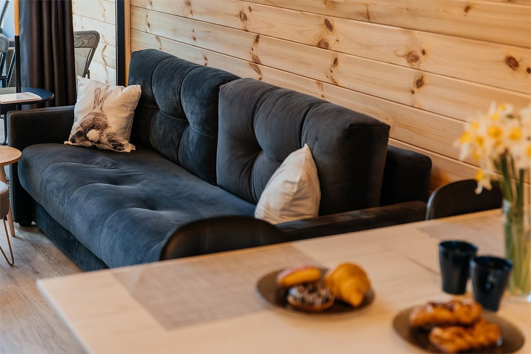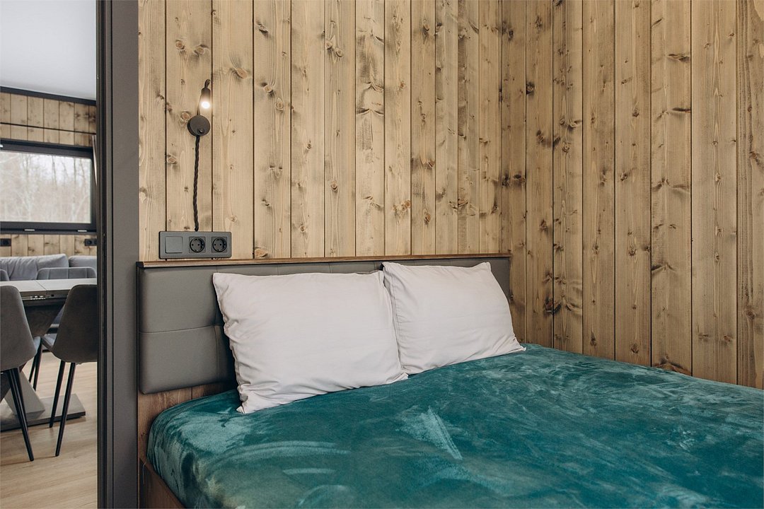 Одноэтажный домик 32м² со спальней, современным дизайном и многими удобствами. Оснащен зоной барбекю и большими панорамными окнами с видом на реку. В доме расположена 1 большая двуспальная и 2 односпальные кровати.Услуги и удобства