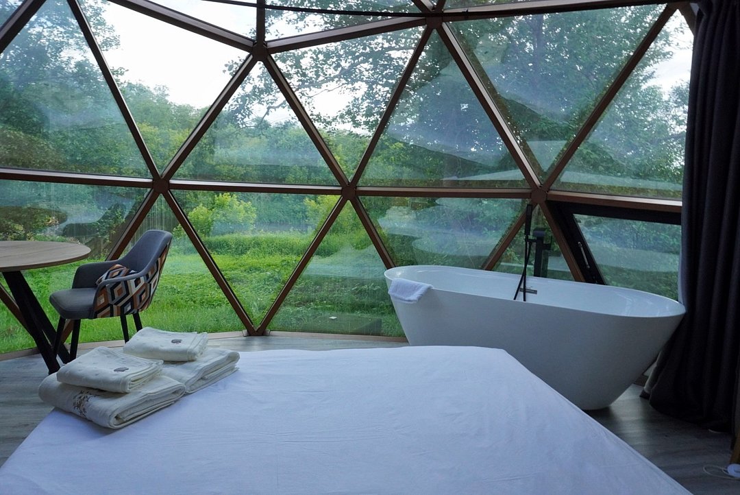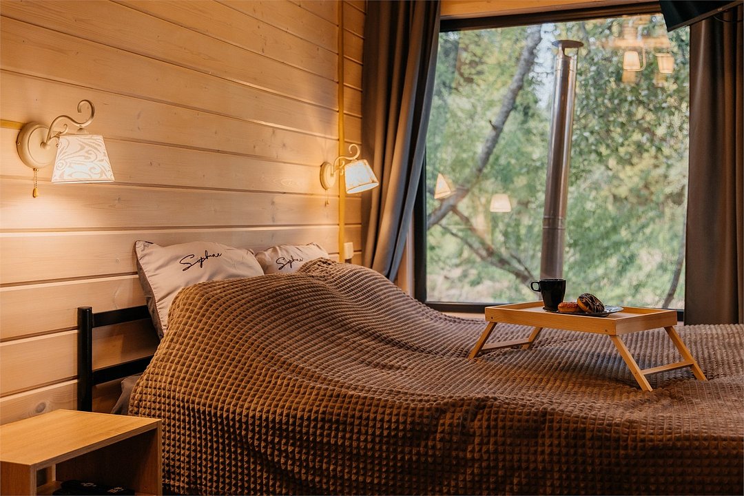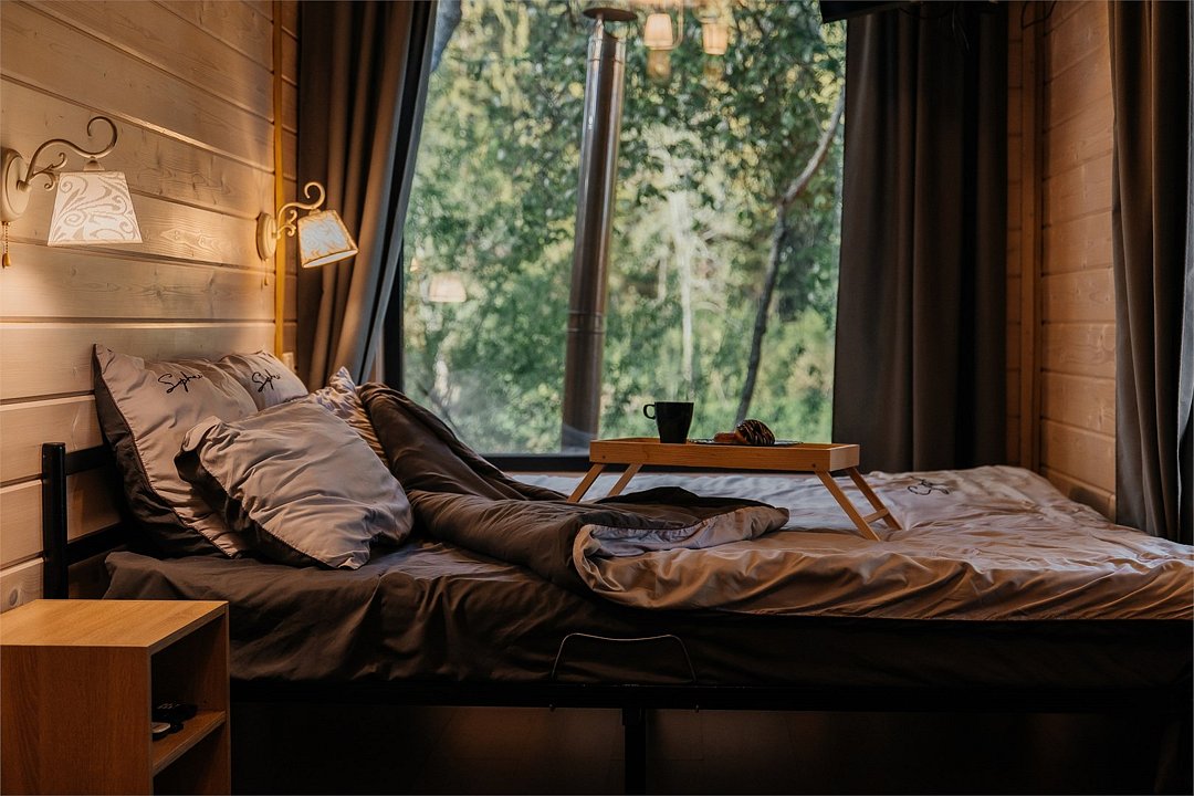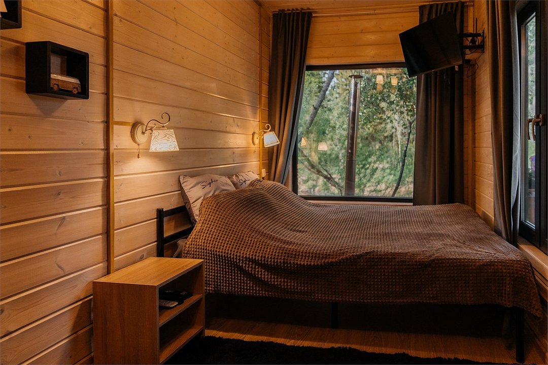 Уникальный домик с ванной около панорамных окон с видом на реку! Одноэтажный домик 32м² со спальней, современным дизайном и многими удобствами. Оснащен зоной барбекю и большими панорамными окнами с видом на реку. В доме расположена 1 большая двуспальная и 2 односпальные кровати.Услуги и удобства