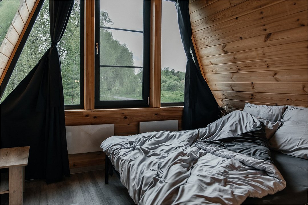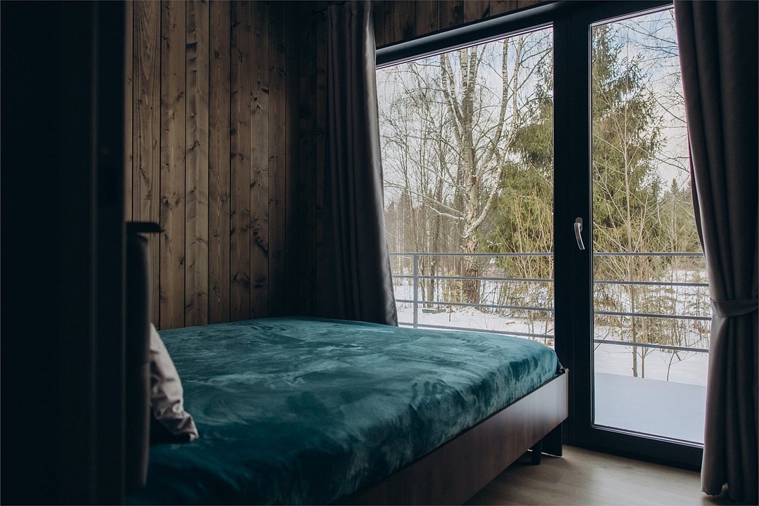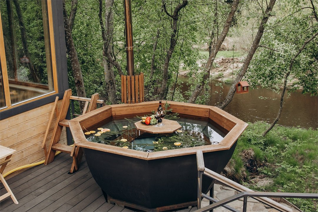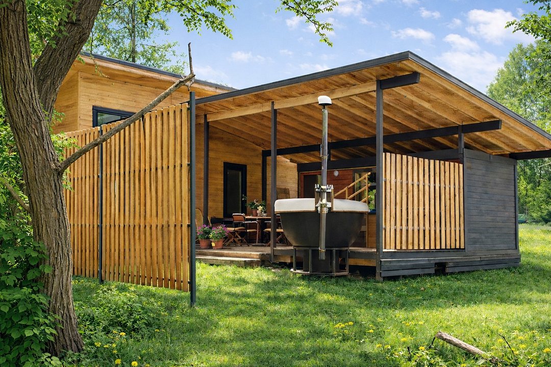 Уникальный одноэтажный домик площадью 32 м² с ванной у панорамных окон — идеальное место для романтичного и атмосферного отдыха с видом на реку. Пространство оформлено в современном стиле и наполнено светом, а расслабляющая ванна с живописным пейзажем создаёт ощущение собственного спа прямо в доме. Домик оснащён зоной барбекю для уютных вечеров на свежем воздухе, а продуманная планировка со спальней, одной большой двуспальной и двумя односпальными кроватями делает его комфортным выбором для семьи или небольшой компании.Услуги и удобства