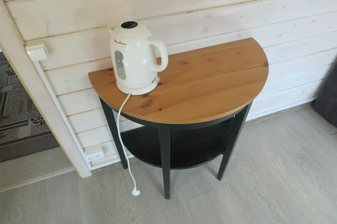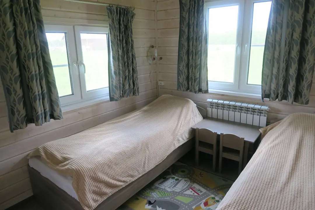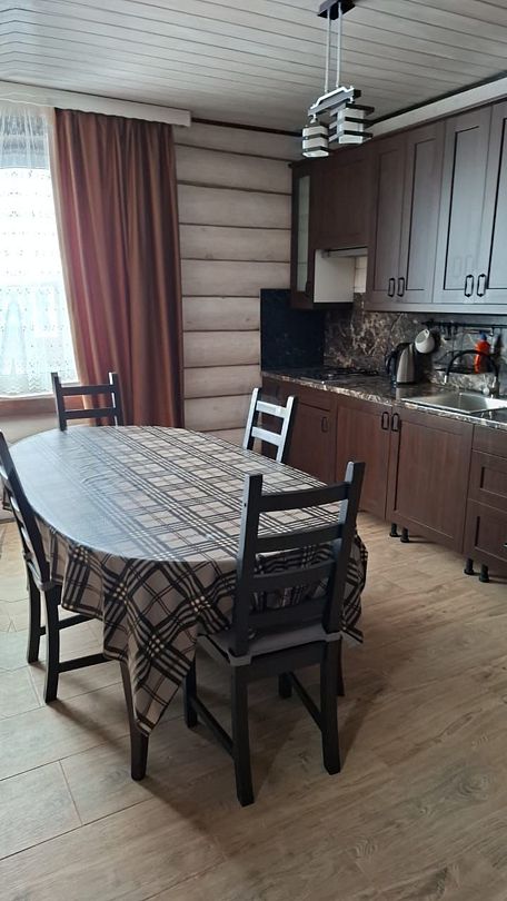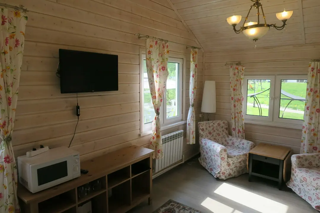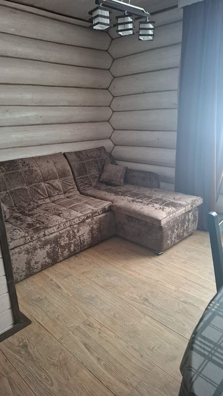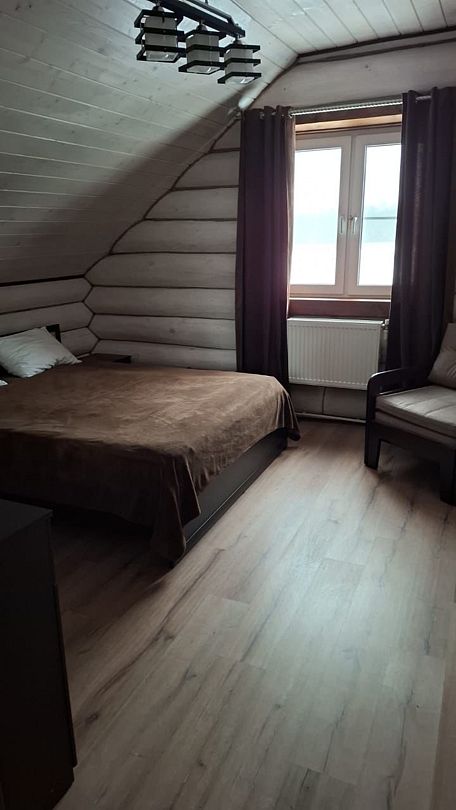Просторный двухэтажный таунхаус площадью 98 м² расположен в половине деревянного дома, построенного из рубленного бревна. В таунхаусе 8 спальных мест, расположенных на двух этажах. Для компаний от 8 до 14 человек дополнительно открывается большой зал площадью 46 м².