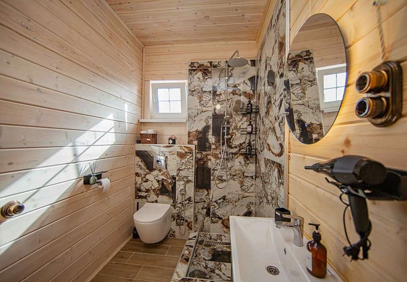 - ТРИ раздельные спальни: две спальни на первом этаже и одна спальня на втором этаже; кухня-гостиная; совмещённый санузел; финская сауна с каменкой SAWO; широкая крытая терраса с летней обеденной группой; индивидуальные: мангал, печь с казаном, костровая зона.