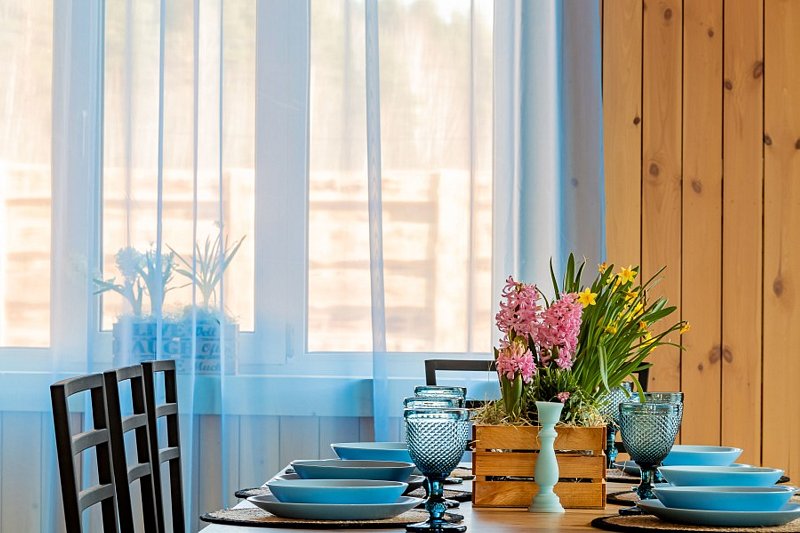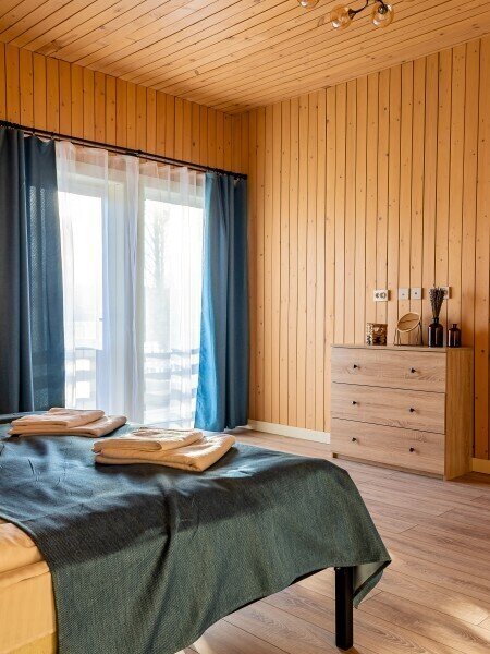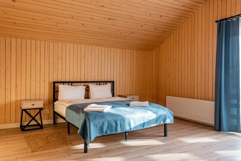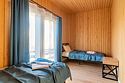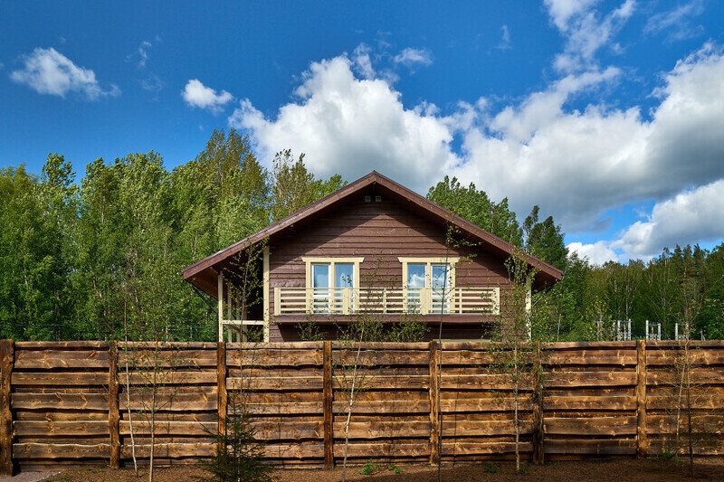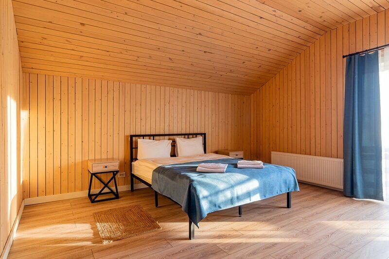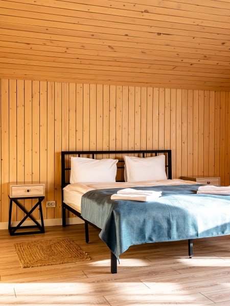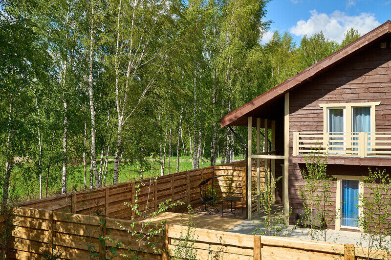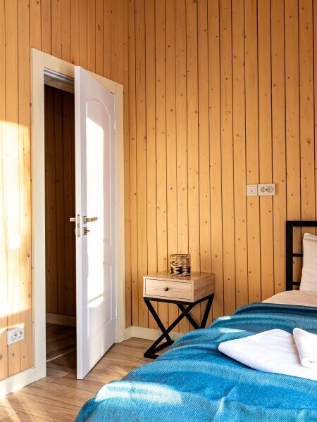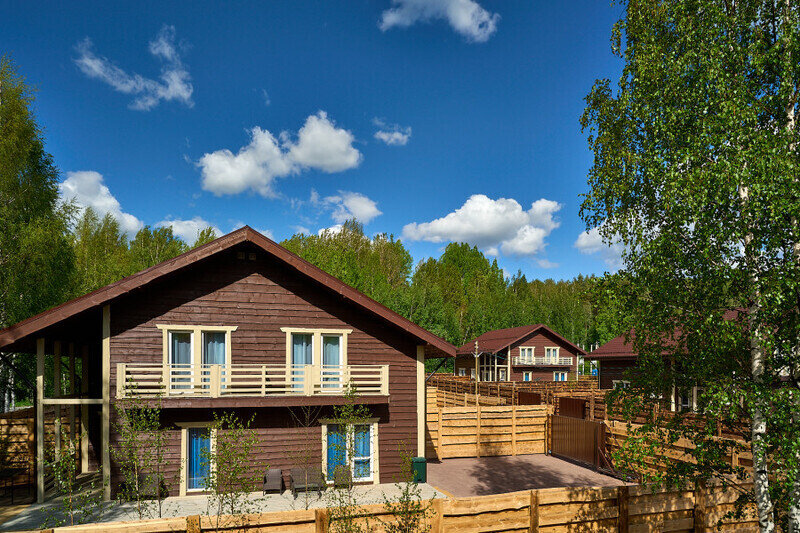 Для комфортного размещения доступны 14 просторных коттеджей премиум класса, построенных из натурального дерева. Каждый коттедж оснащен всем необходимым для приятного времяпрепровождения: