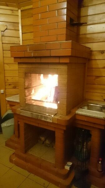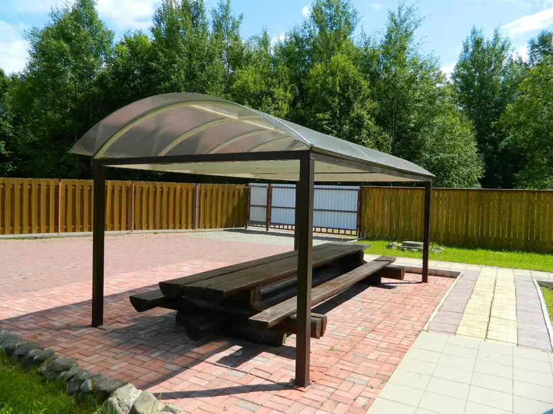 Теплая беседка с камином и большим столом. Здесь можно собраться компанией до 15 человек, пожарить шашлык, спеть караоке, покурить кальян, поиграть в игры.