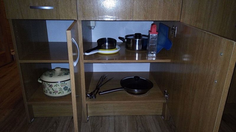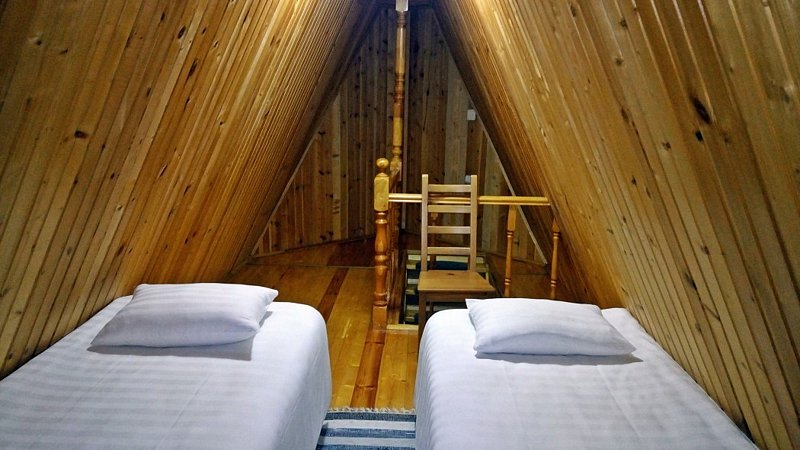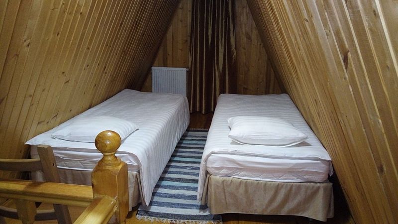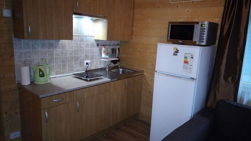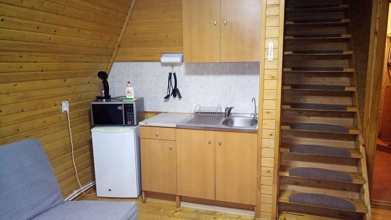 На первом этаже гостиная с двуспальным диваном, обеденной зоной и спутниковым ТВ. На втором этаже спальня с двумя кроватями 90*200, с возможностью их объединения. В гостиной также расположена мини-кухня с холодильником, микроволновой печью, варочной поверхностью и чайником. Комплект столовой посуды на 4 человека, кастрюли, сковорода. Санузел совмещен, оборудован системой «теплый пол», есть душ и фен.