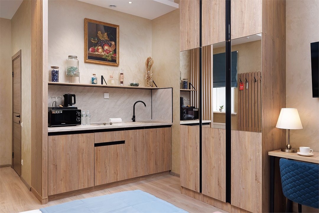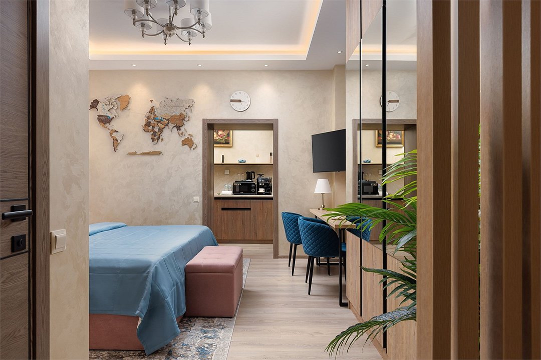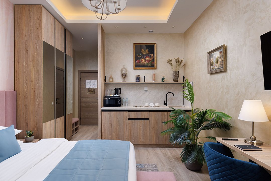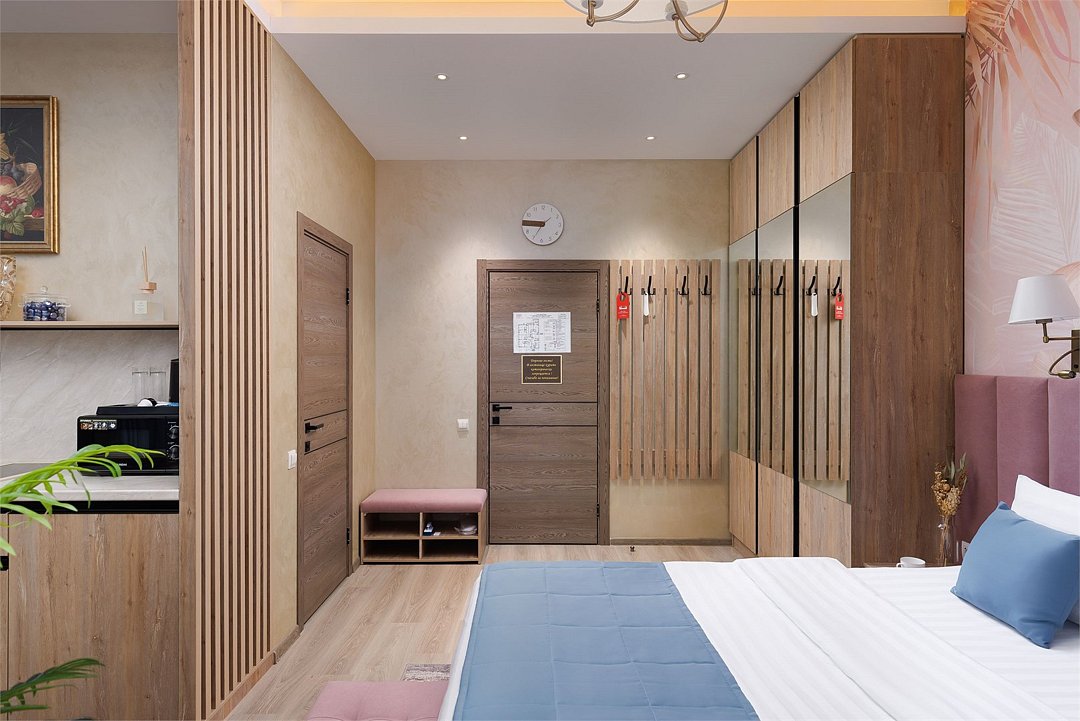 Номер-студия с собственным санузлом. В номере: двуспальная кровать с ортопедическим матрасом, прикроватные тумбы, телевизор, шкаф для одежды, стол и стулья, холодильник, кофемашина, электрический чайник.