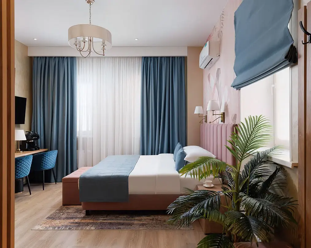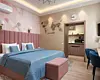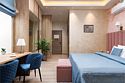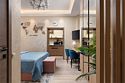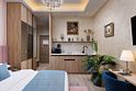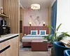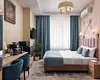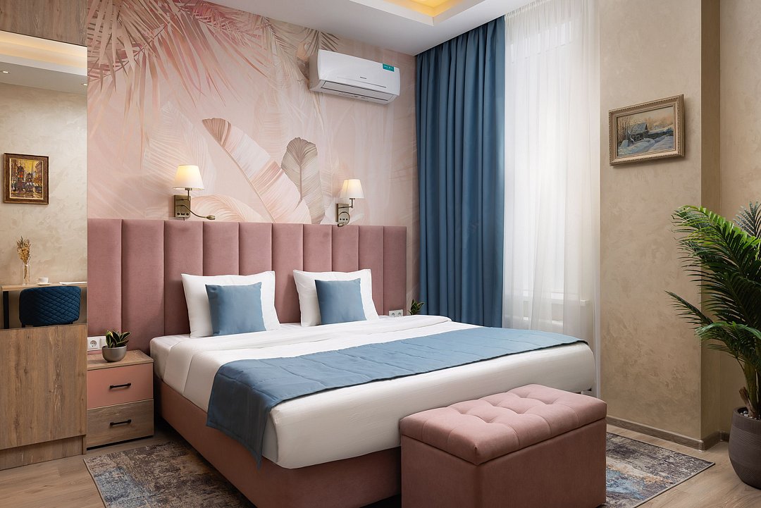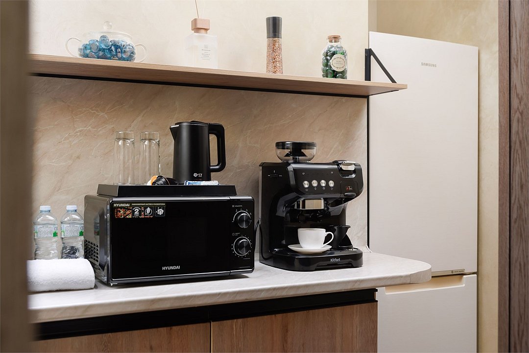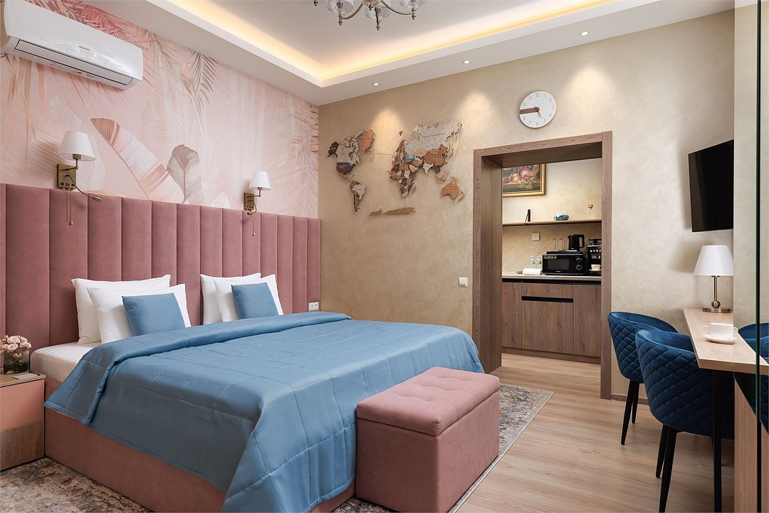 Номер-студия с собственным санузлом. В номере: двуспальная кровать с ортопедическим матрасом, прикроватные тумбы, телевизор, шкаф для одежды, стол и стулья, холодильник, кофемашина, электрический чайник.