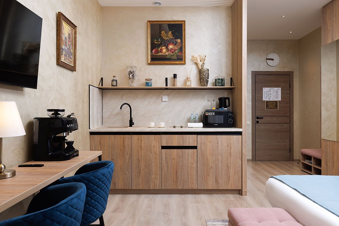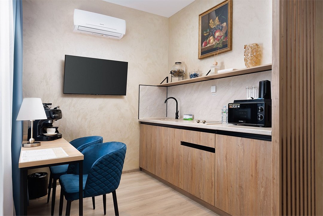 Номер с собственной ванной комнатой и мини-кухней. Наполнение номера: двуспальная кровать с ортопедическим матрасом, прикроватные тумбы, шкаф для одежды, стол и стулья, телевизор. На кухне есть плита для приготовления еды, холодильник, электрический чайник, кофемашина и необходимый набор посуды для двух человек.
