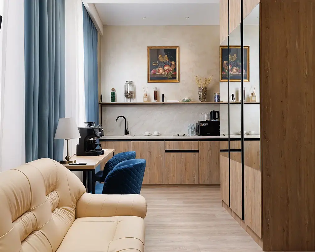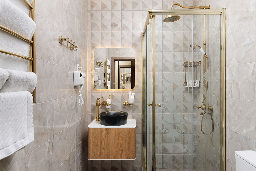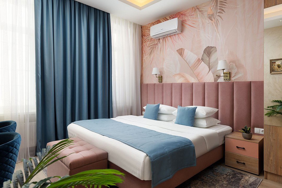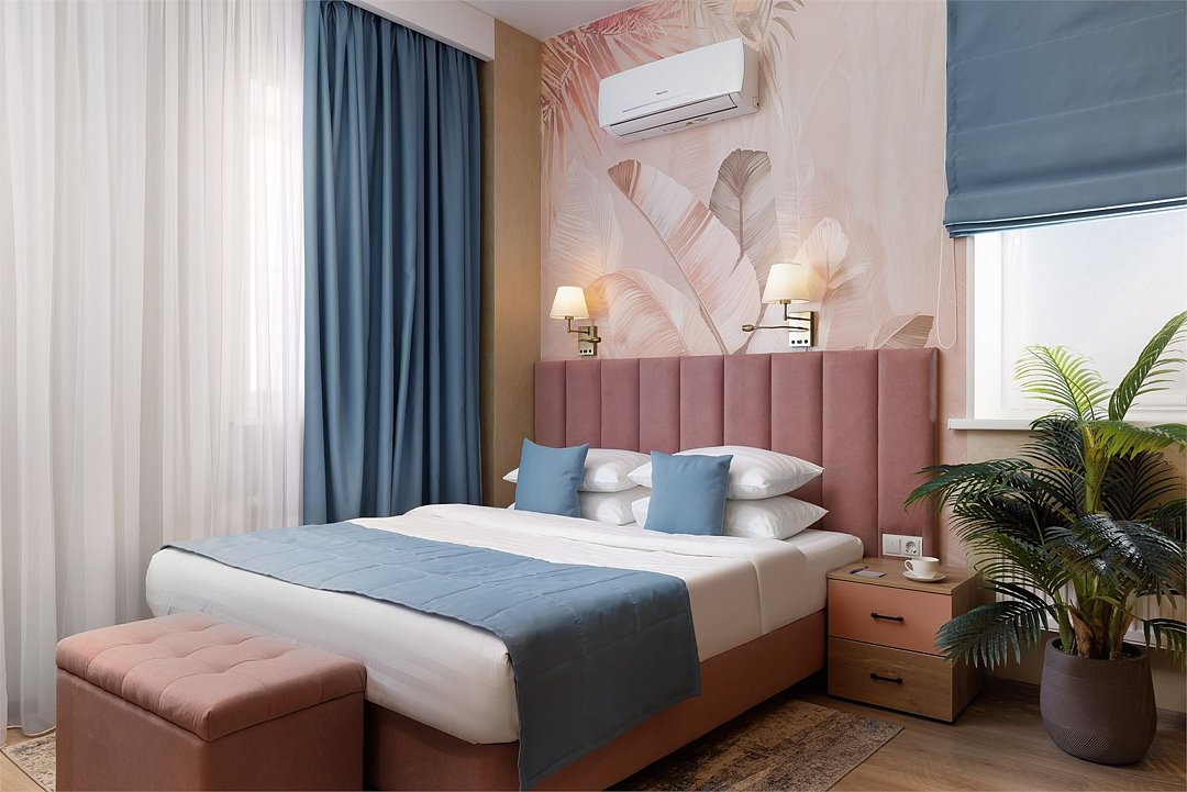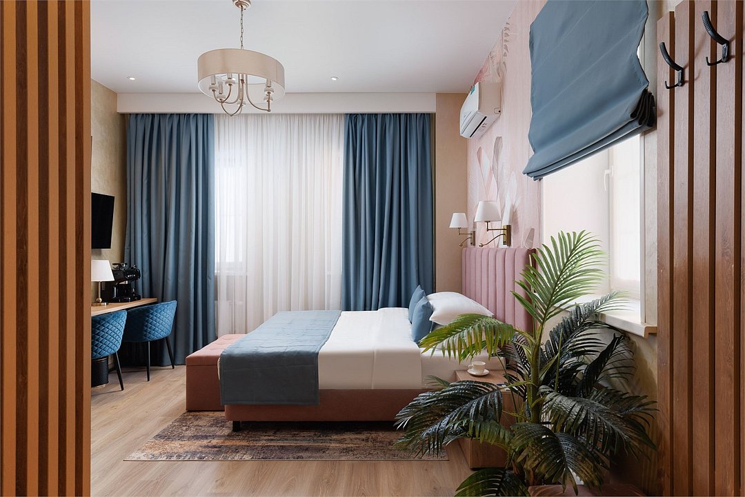 Номера отеля полностью оснащены для вашего комфортного отдыха. Во всех номерах есть мини-кухня с холодильником, варочной плитой, электрическим чайником, кофемашиной и набором посуды, телевизор и бесплатный Wi-Fi, а также современный санузел с душем. Дизайнерский ремонт в каждом номере выполнен в спокойной цветовой гамме, чтобы отдых был приятным и расслабляющим.