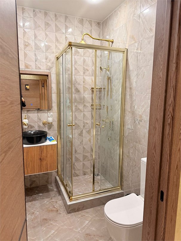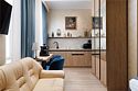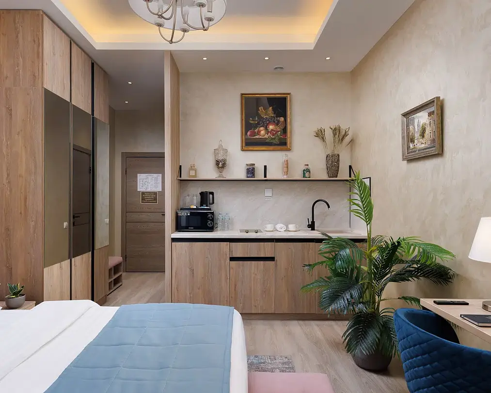 Большой номер с собственной ванной комнатой и мини-кухней. Наполнение номера: двуспальная кровать с ортопедическим матрасом, диван, прикроватные тумбы, шкаф для одежды, стол и стулья, телевизор. На кухне есть плита для приготовления еды, холодильник, электрический чайник, кофемашина и необходимый набор посуды для двух человек.
