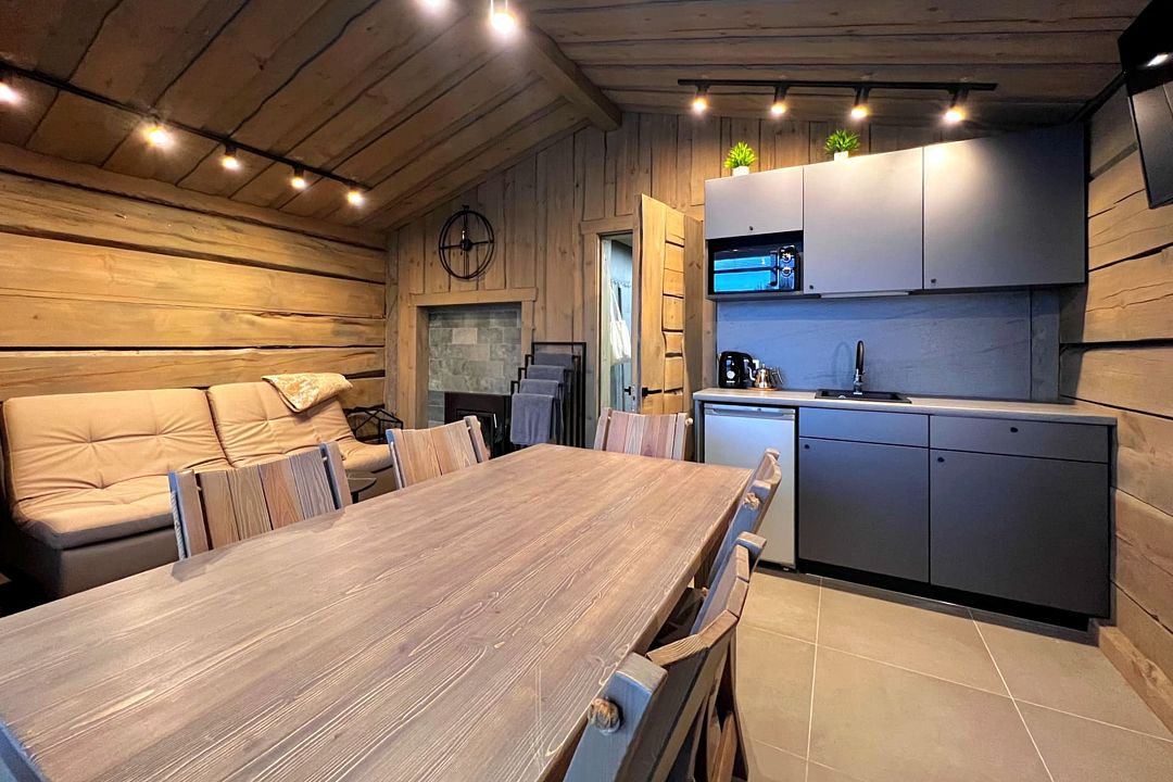 Инфраструктура: тапочки, зона отдыха, полотенца, обливное ведро, душРасположение: выход к озеруМинимальное время аренды: 2 часаВремя работы: от 12 до 22Баня вмещает до 6 гостей. Есть обливная система, душ, зона отдыха, кухня, санузел.