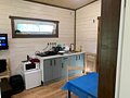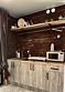 Кухня-гостиная с раскладным диваном, а также лофт-этажом со спальным местом 140х200. Кухня оснащена холодильником, микроволновой печью, индукционной плитой на 2 конфорки, чайником.