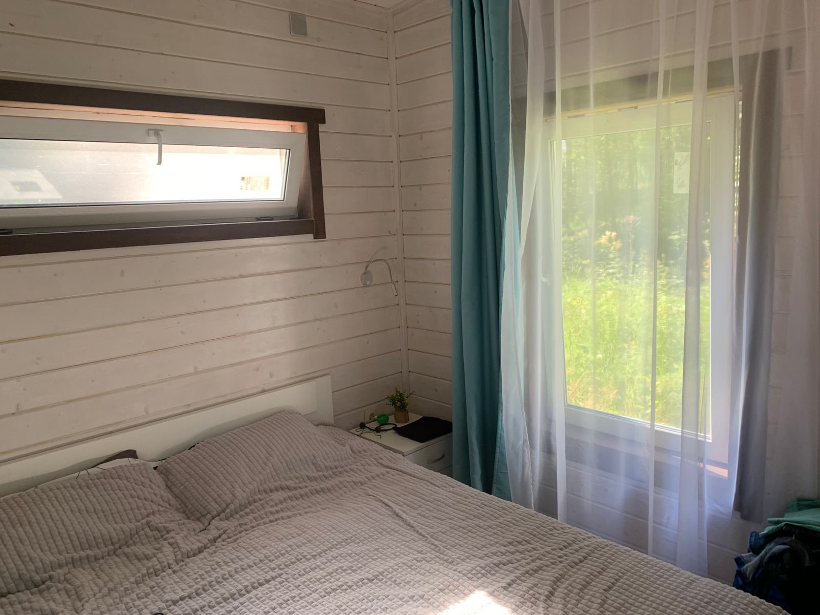 Уютный дом вместимостью до 6 человек. К Вашим услугам rрытая терраса 12 м² с уличной мебелью. Спальня с большой двуспальной кроватью 160х200 и панорамным окном с видом на Карельский лес, комод.