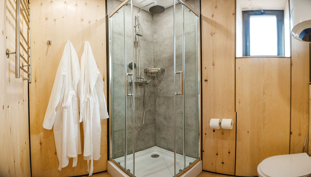 В каждом доме панорамные окна с видом на горы, камин, теплый пол, горячий душ (водонагреватель 100л), туалет, полотенцесушитель, фен.