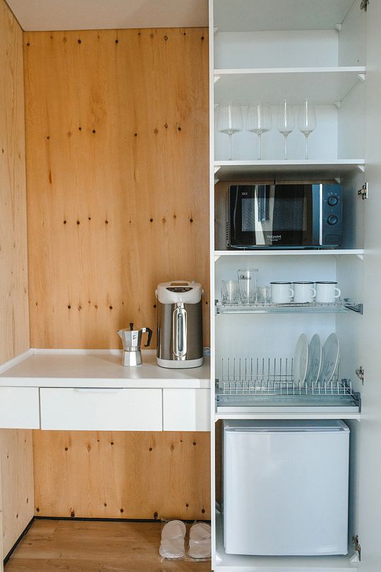 Матрасы «Орматек», белое сатиновое белье, халаты, набор полотенец, тапочки, индивидуальные средства гигиены, система хранения вещей, холодильник, микроволновая печь, чайник, набор тарелок, комплект столовых приборов, чайные пары, бокалы для вина.