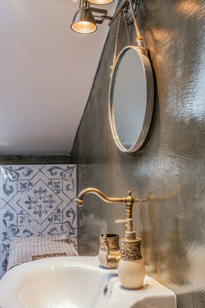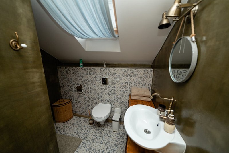 В номере две раздельные односпальные кровати (либо одна двуспальная кровать, на выбор), а также можно поставить кровать для ребенка до 18 лет. Ванная комната выполнена в стиле «Лофт», имеются высококачественные бронзовые смесители. Столешница выполнена из массива сосны, установлена на старинной станине XIX века. Все окна расположены в мансардной крыше. Это идеальный вариант, если вы приезжаете в одиночку или парой, но возможно и размещение семьей до 3 человек.