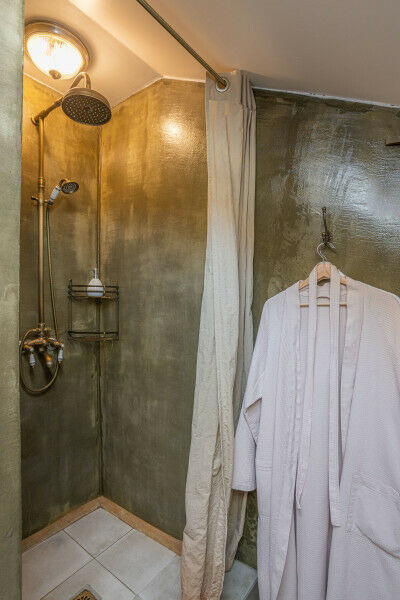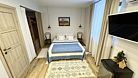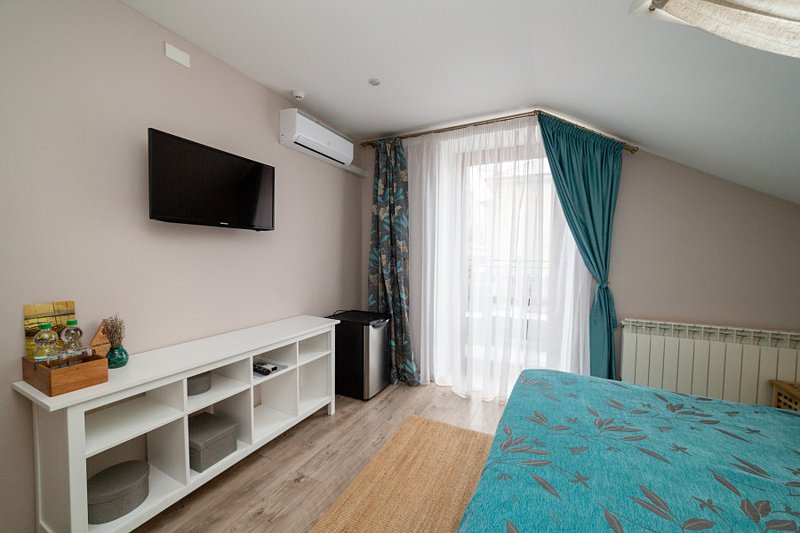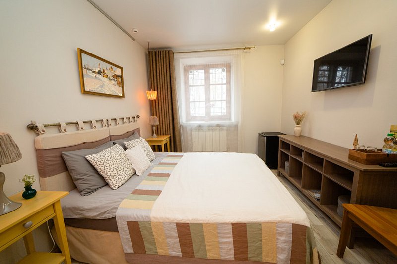 В номере имеется большая двуспальная кровать ( 160см) с ортопедическим матрасом. Номер декорирован элементами старинной мебели (зеркало XIX века). Ванная комната просторная и стильная, отделана испанской плиткой, имеется большое окно, выходящее на внутренний двор.