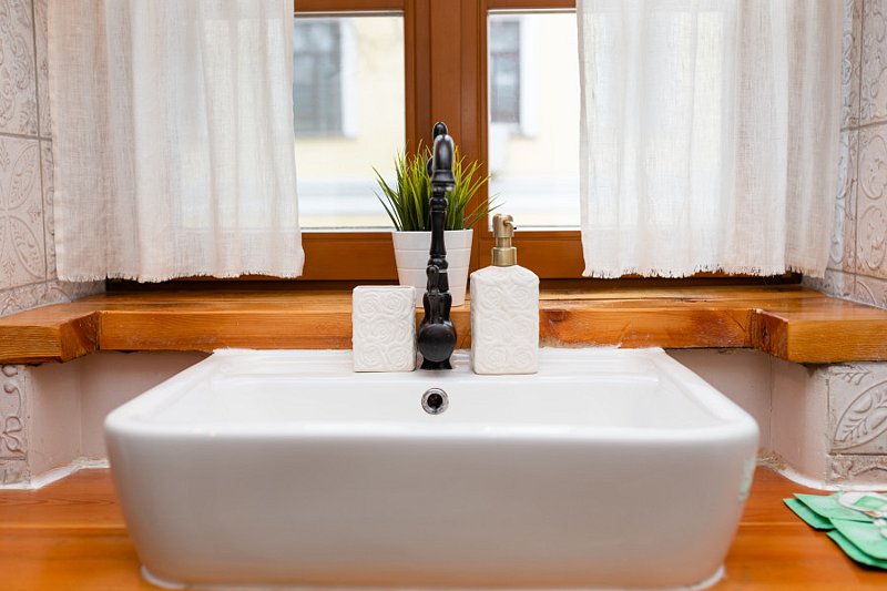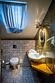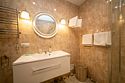 Санузел выполнен в классическом стиле, имеется раковина из натуральной камня, бронзовые смесители.