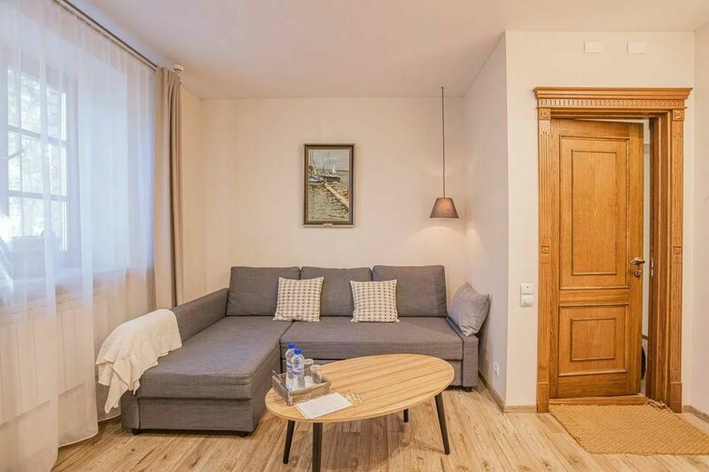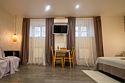 Просторный семейный номер, в котором может комфортно разместиться 4 человека. В номере большая двуспальная кровать (160 см) с ортопедическим матрасом и угловой диван, который раскладывается на два дополнительных спальных места. Дизайнерские европейские обои в номере придают ему легкий шарм. Имеется обеденный стол, который можно использовать также как стол для работы. Уютная ванная комната с итальянской душевой кабиной стильная и спокойная. Окна выходят на внутренний дворик.