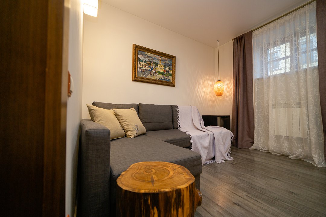 Просторный, светлый и тихий номер, подходит для размещения семьи или компании из 4 человек. В номере большая двуспальная кровать и угловой диван, который раскладывается на два дополнительных спальных места.