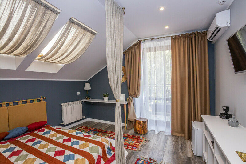 Кровать размера «king-size» расположена на подиуме с множеством мягких подушек, свисающие с потолка светильники создают игривое романтическое настроение. Есть выход на балкон. На балконе стоит уютная мебель, здесь можно проводить время тихими вечерами. Это очень атмосферный номер благодаря мансардным окнам, стеклянной двери, уютному балкону. Окна выходят в тихий внутренний дворик, здесь вы будете чувствовать себя очень уединенно! Это идеальный вариант если вы приезжаете в одиночку или парой!