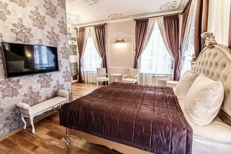 В номере вы найдёте телевизор и халат. Оснащение зависит от выбранной категории номера.