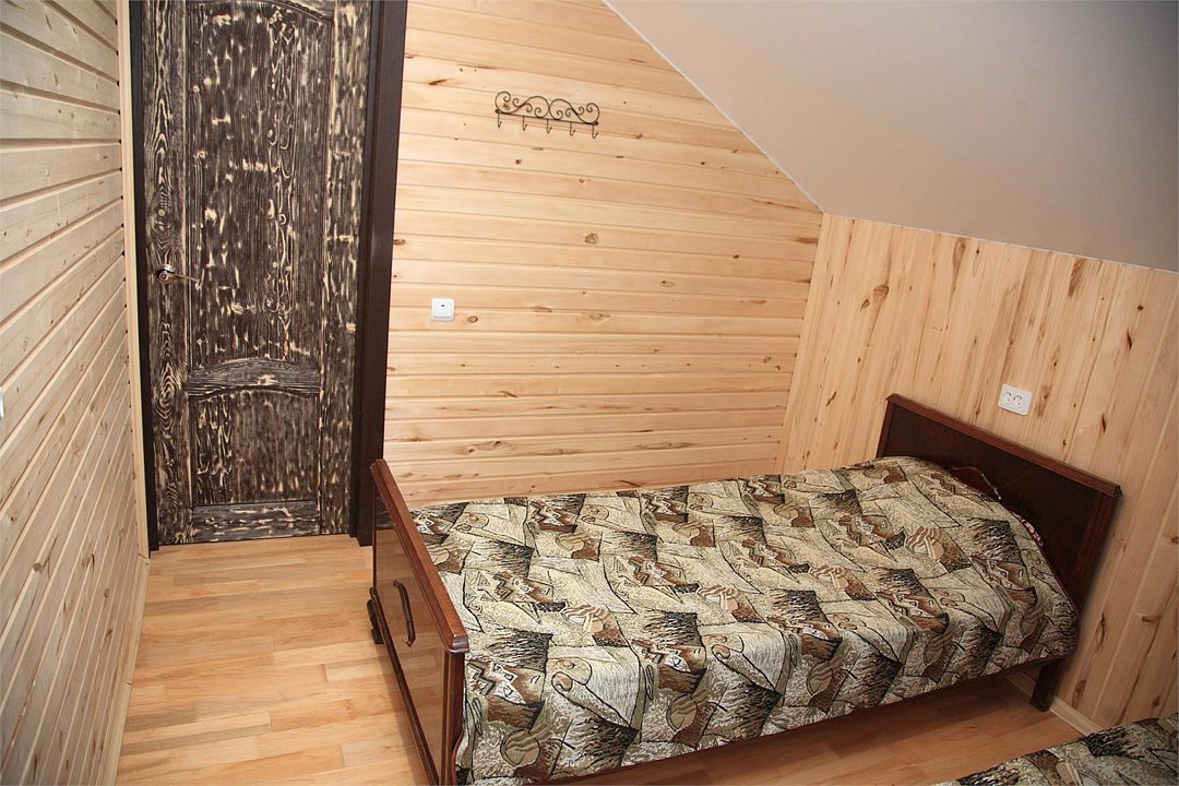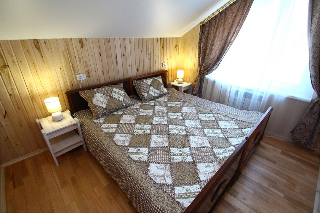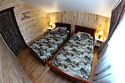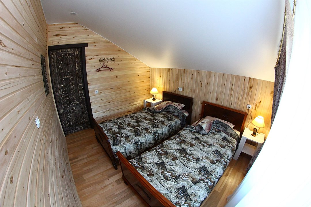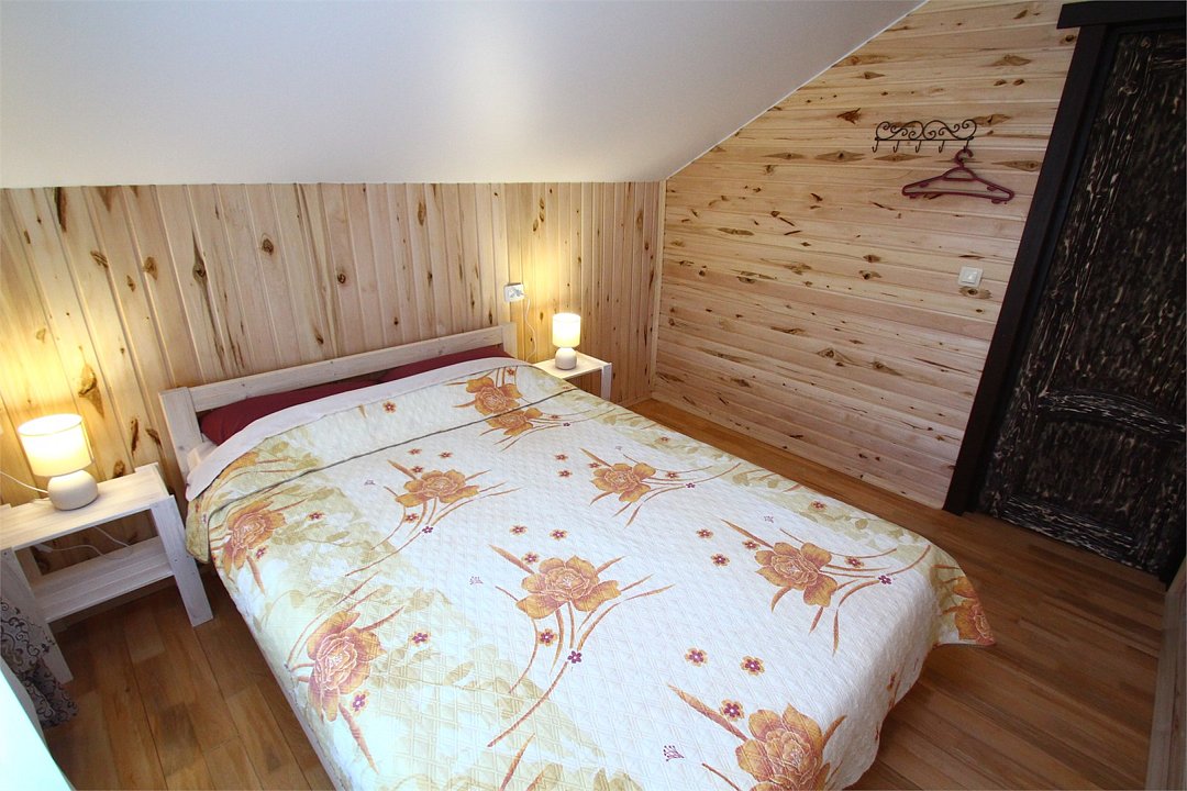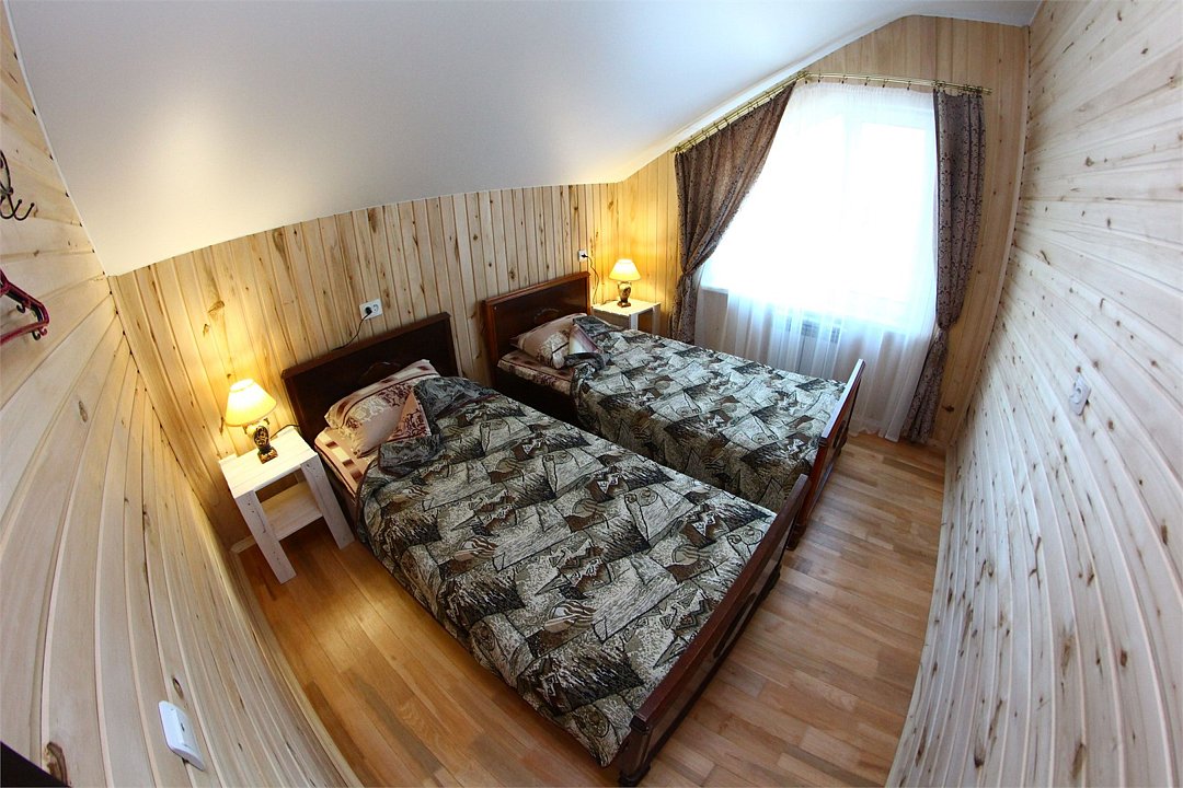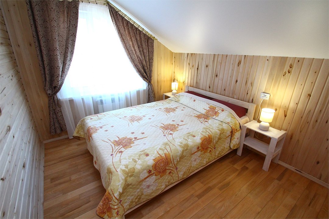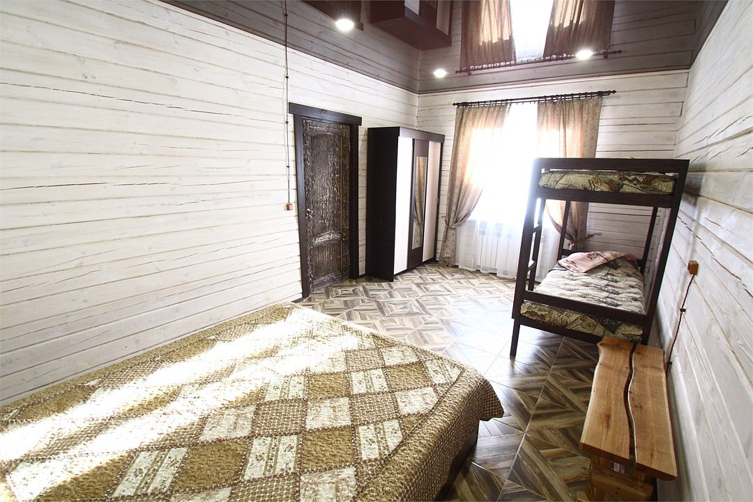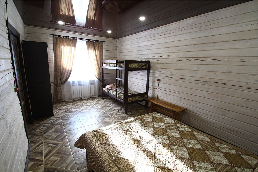 Просторный семейный номер с двухспальной кроватью и двухъярусной кроватью. В номере есть шкаф, номер выполнен в экостиле из экологически чистых материалов.Услуги и удобства