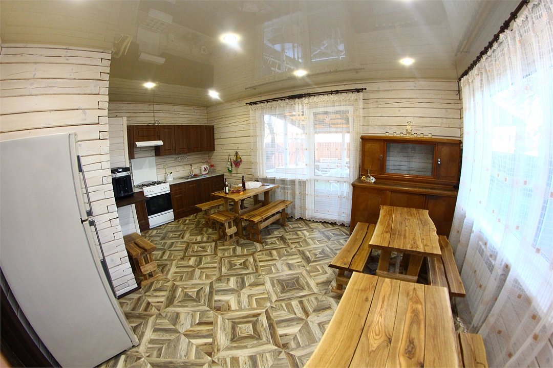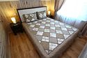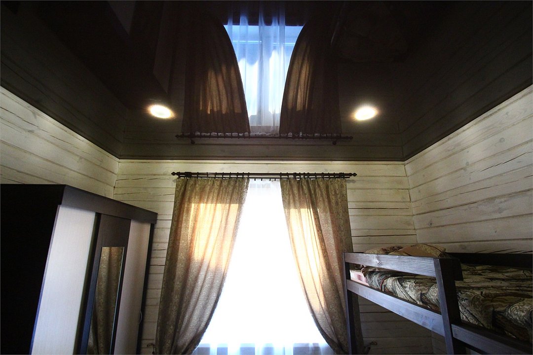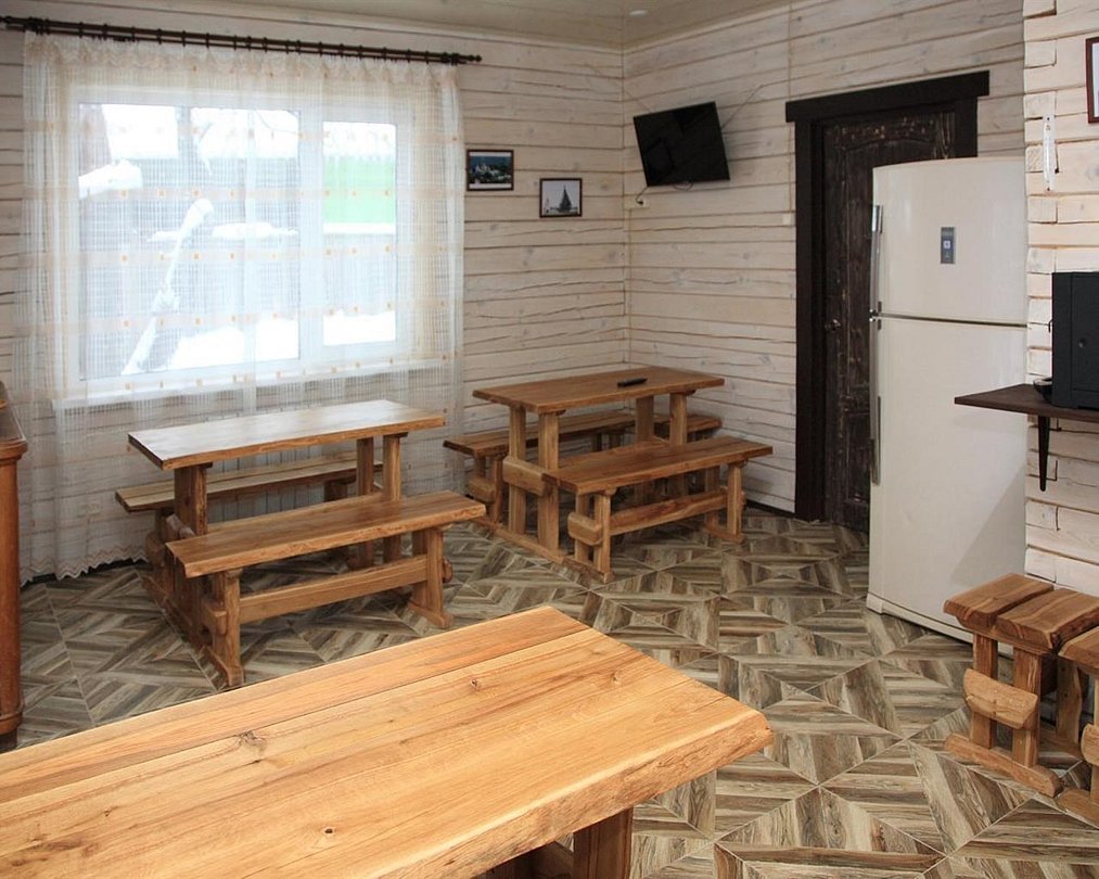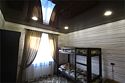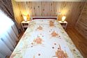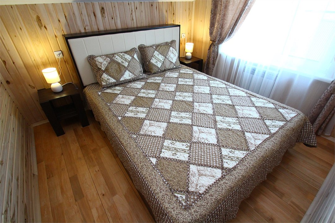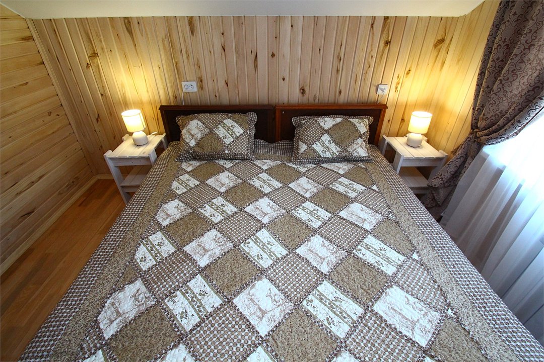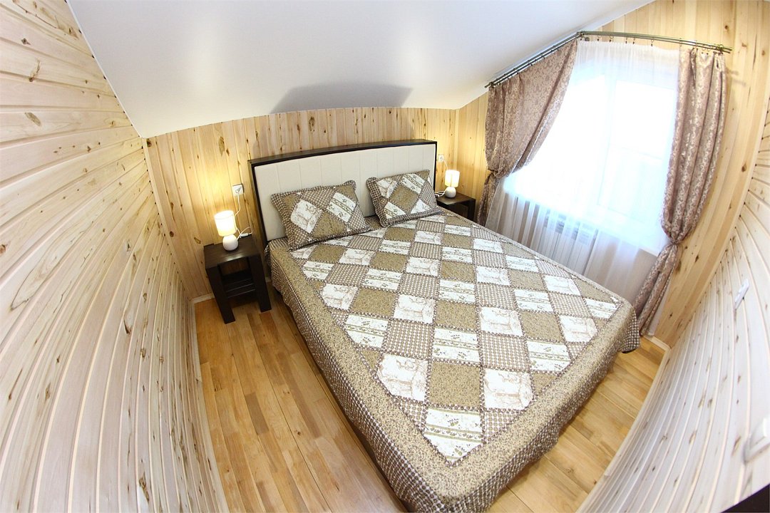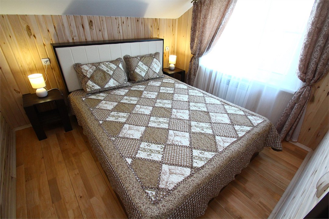 Просторный семейный номер с двухспальной кроватью и двухъярусной кроватью. В номере есть шкаф, номер выполнен в экостиле из экологически чистых материалов.Услуги и удобства