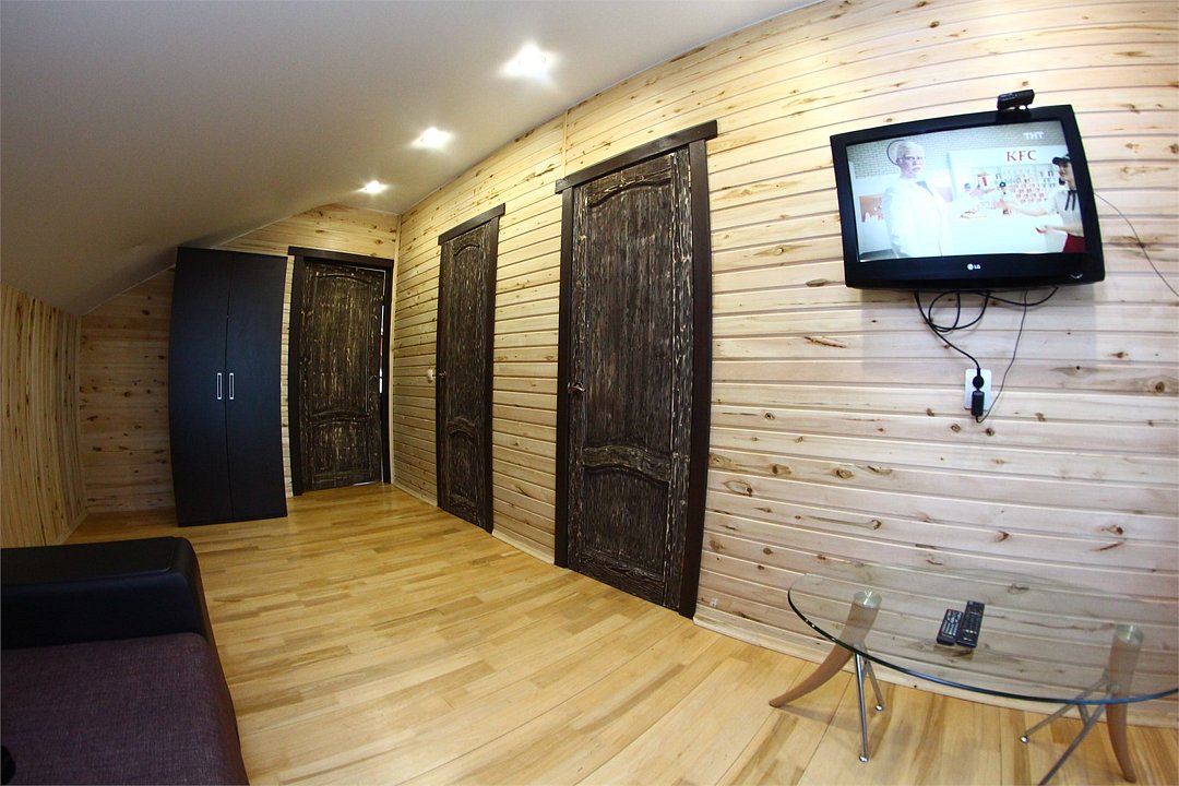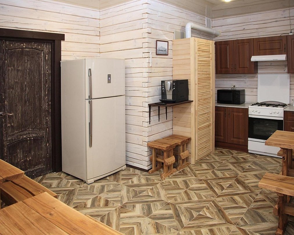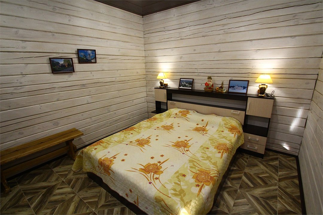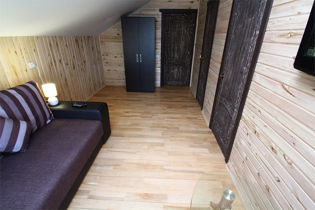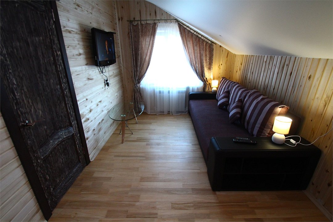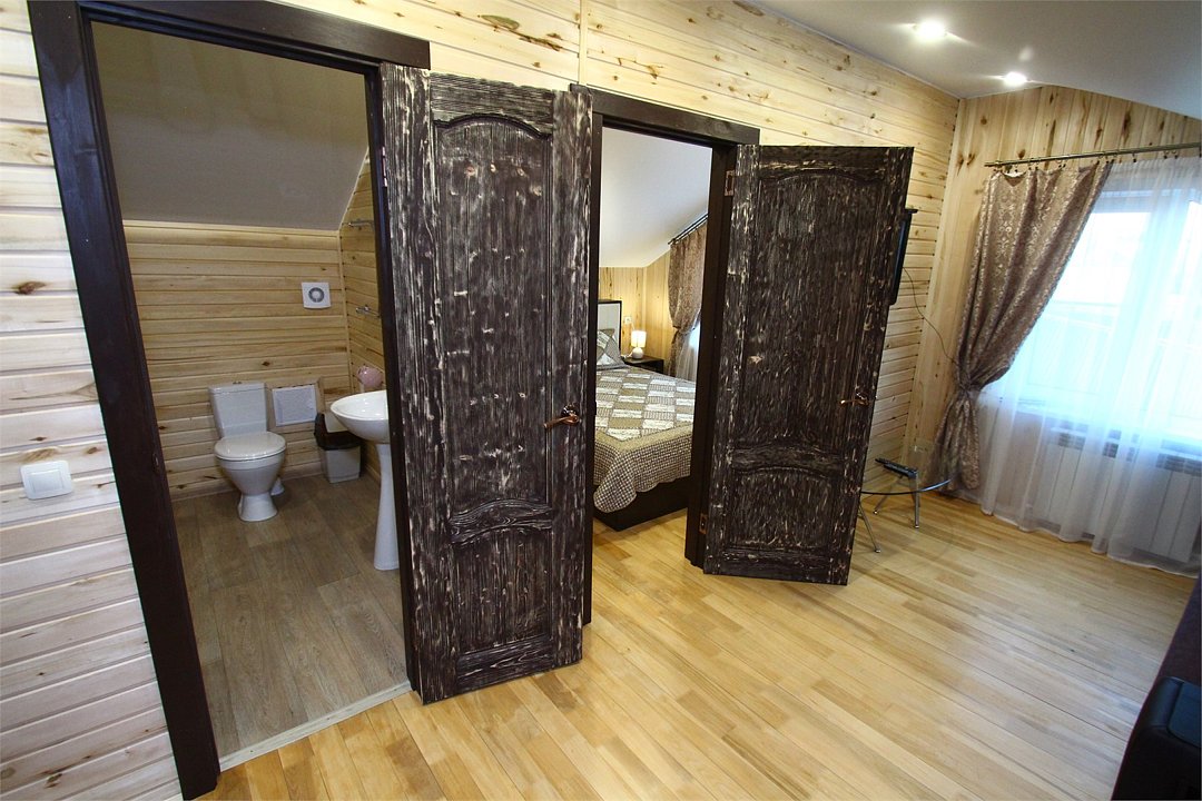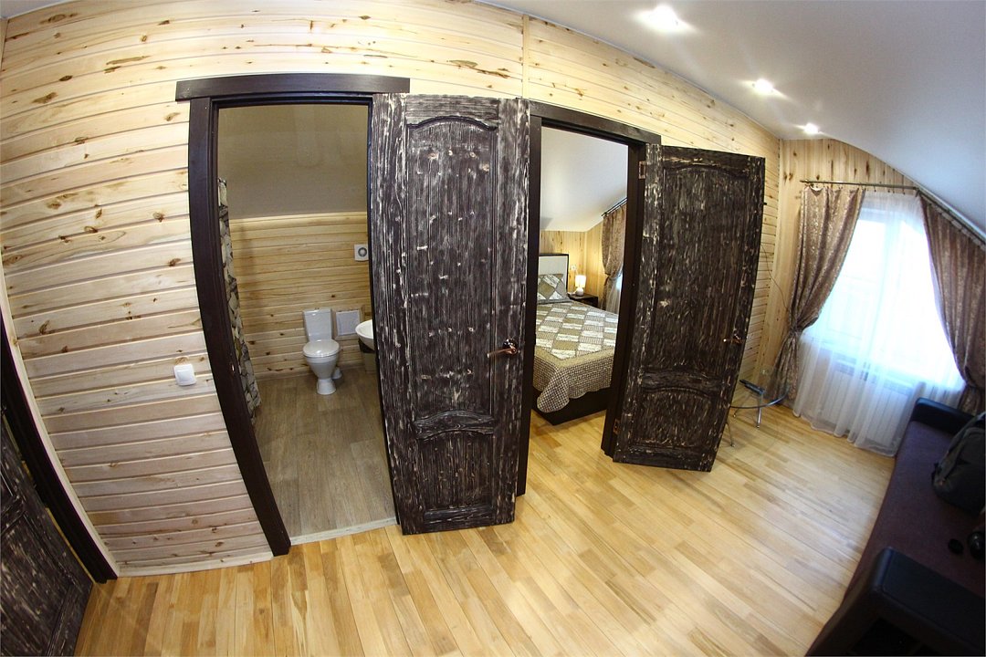 Уютный двухкомнатный номер с видом на сад. Стены выполнены из липовой вагонки. Номер гипоаллергенный. Пол паркетный из черной ольхи.Услуги и удобства