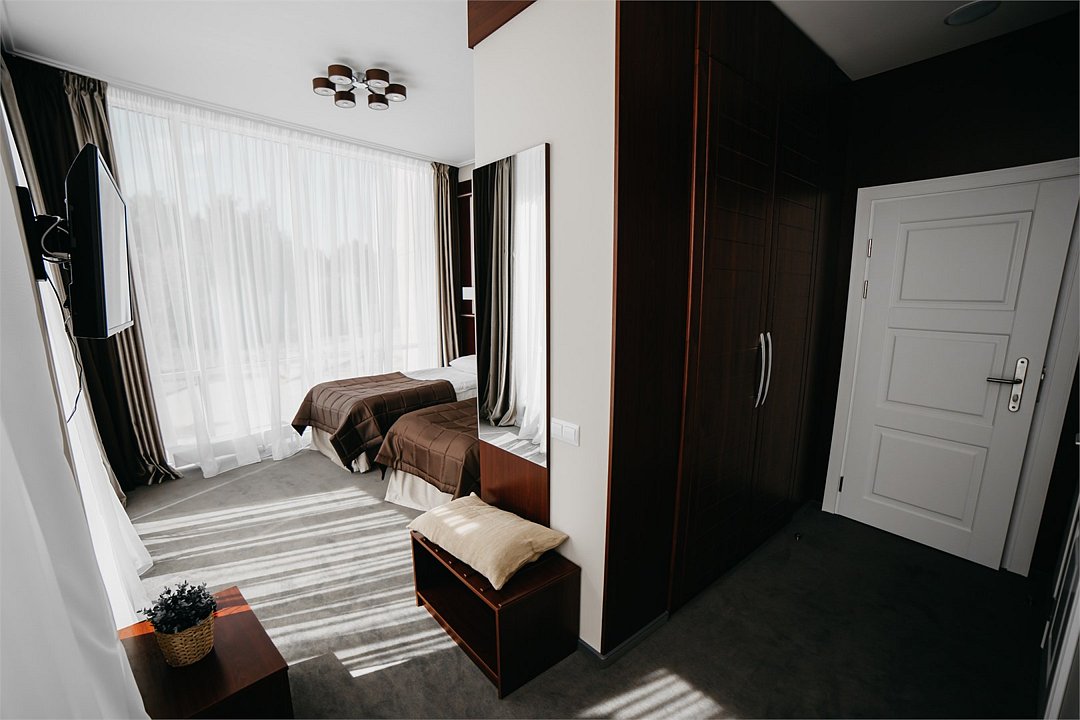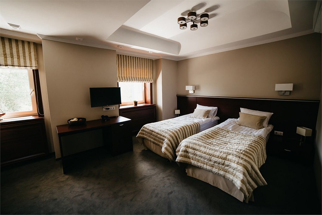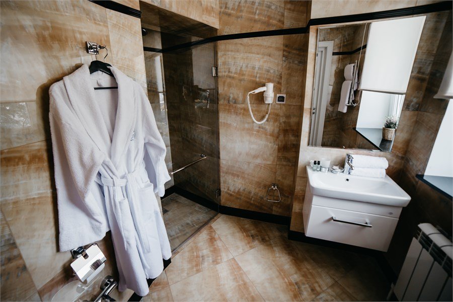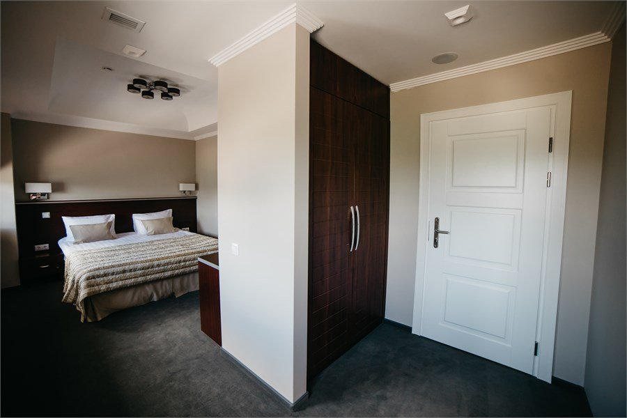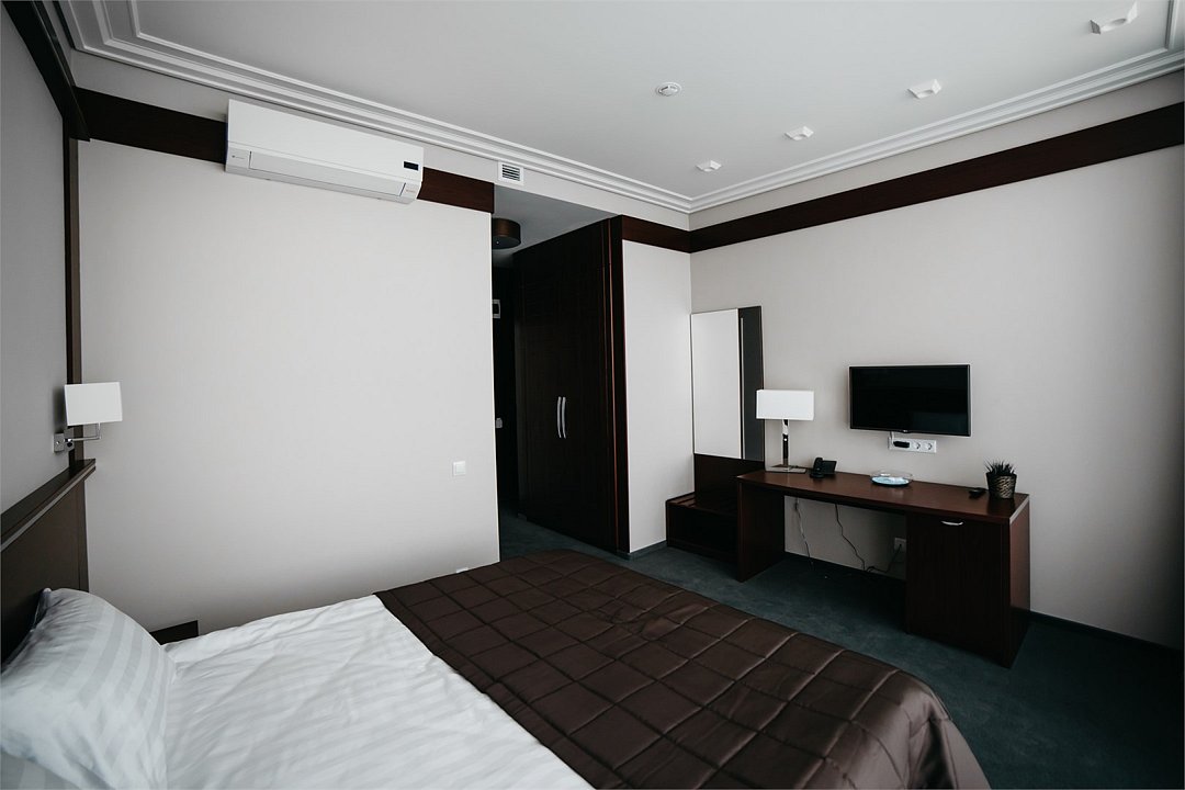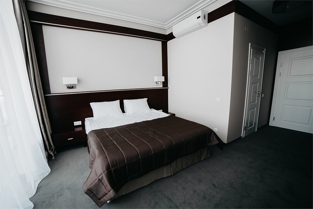 Элегантный, двухкомнатный номер «Люкс» на 1 этаже. В номере есть все необходимое, чтобы Вы могли раствориться в его гостеприимной атмосфере и великолепно отдохнуть. Большая кровать с удобным, ортопедическим матрасом, просторная гостевая часть номера дают возможность расположиться с комфортом и почувствовать себя уютно, как дома. В роскошной ванной комнате установлена большая ванна-джакузи, в которой так приятно расслабиться после насыщенного дня. К Вашим услугам сейф, письменный стол, LED – телевизор, холодильник с мини — баром, чайный набор. Приятным дополнением к номеру является большой балкон, с которого открывается уникальный вид на исторический центр города.Услуги и удобства