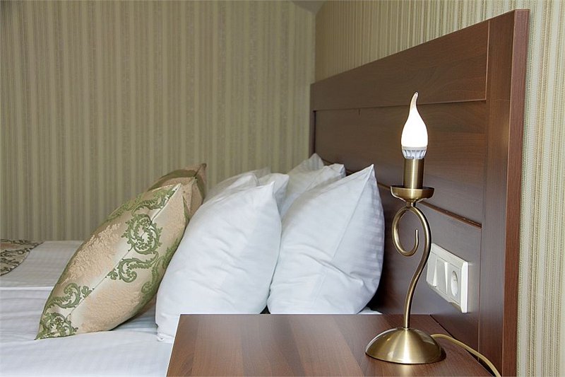 В номере современная мебель, одна широкая кровать (160*200см), или две раздельные кровати (90*200см), а так же организованное рабочее пространство с письменным столом.