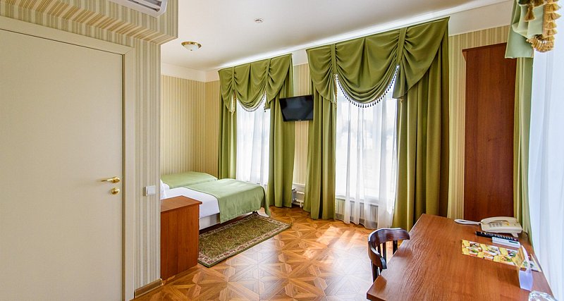 Уютные однокомнатные номера выполнены в классическом стиле начала XIX века. Номера состоят из небольшой прихожей и спальной комнаты.