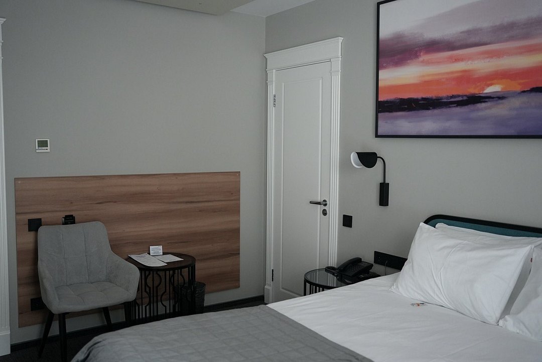 телевизор, Wi-Fi, телефон, кондиционер, настольные лампы, фен, электронные замки, ванная комната, теплый пол, халаты, банные полотенца, тапочки, гигиенические средства, двуспальная кровать, тумбы, шкаф для одежды, вешалки, письменный стол, багажная тумба, зеркало, мини-бар, сейф, питьевая вода, вид на город, вид во двор, стул, сплит-система, мини-холодильник, фанкойл, без питомцевВ номере