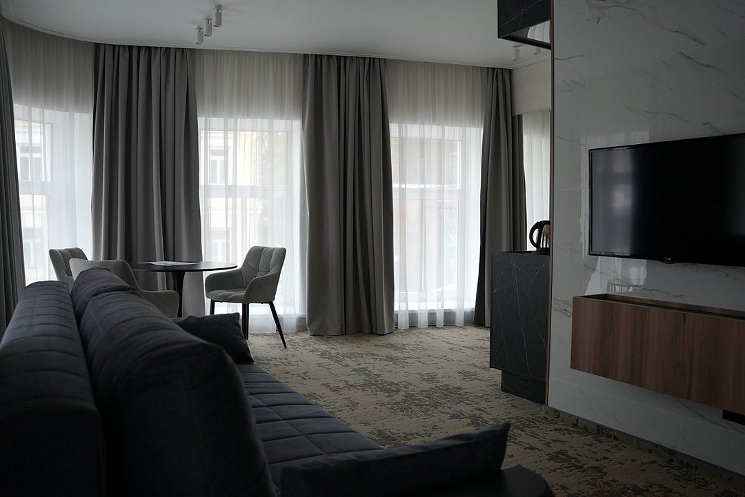 Просторные, комфортабельные номера (54 кв.м) обставленные в современном стиле разделены на гостиную и спальную зоны. Продуманный интерьер и декор обеспечивают приятное пребывание и отдых. В каждом номере индивидуальная система кондиционирования и отопления. Удобная мягкая мебель, LED-телевизор, большая двуспальная кровать с ортопедическим матрасом, антиаллергенные подушки, сейф для хранения ценностей, минибар, принадлежности для приготовления чая или кофе. Люкс, включает просторную ванную комнату. Имеет подогреваемый пол, фен, набор косметики, махровый халат и тапочки. Гости Люкс получают бесплатный завтрак в ресторане отеля, Wifi Интернет по всей территории отеля, бесплатные местные телефонные звонки.Услуги и удобства