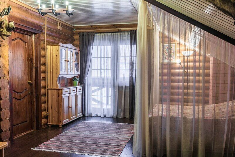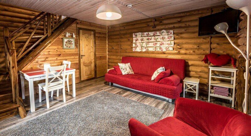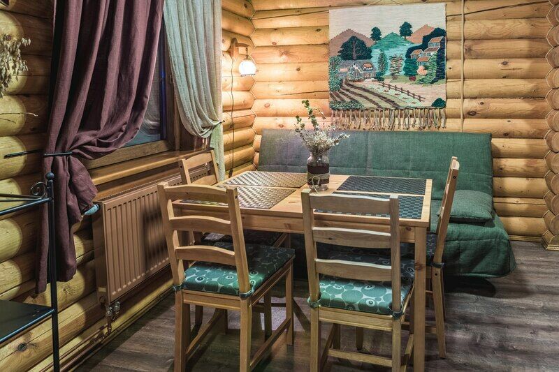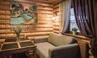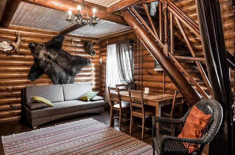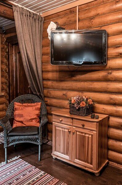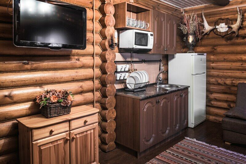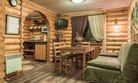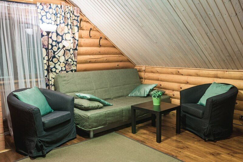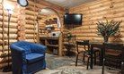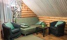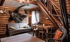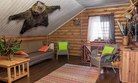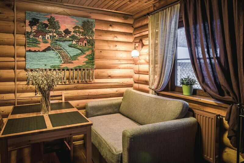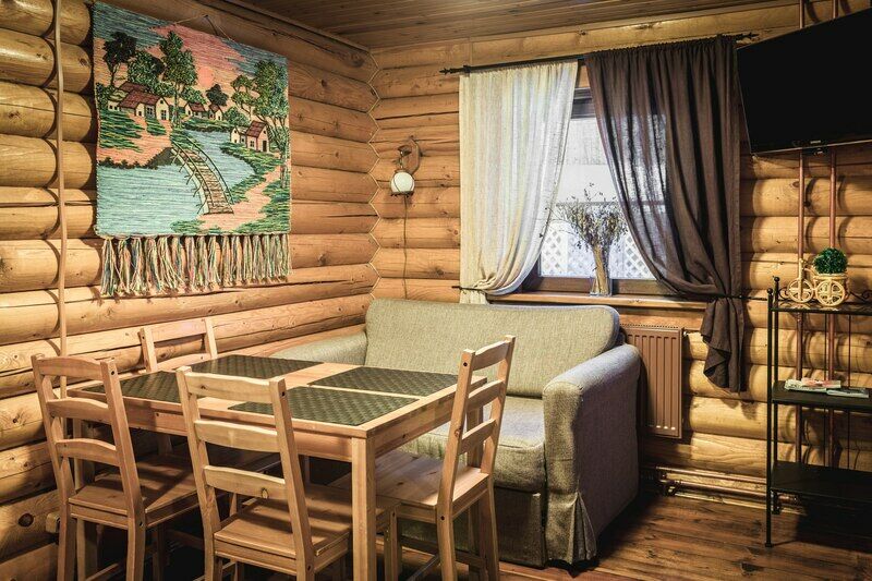 В мансарде коттеджа категории «Комфорт» три спальни с двуспальными кроватями, гостиная (диван и два кресла, журнальный стол). На первом этаже оборудованная кухня-столовая (электроплита, холодильник, СВЧ печь, набор посуды, шампура), русская баня на дровах, санузел. Телевизоры со спутниковой антенной расположены на 1-м и 2-м этаже. Интерьер коттеджа выполнен в стиле охотничьего домика. Рядом с коттеджем – индивидуальная площадка для барбекю с мангалом. Общая площадь коттеджа – 110 кв. м.