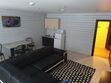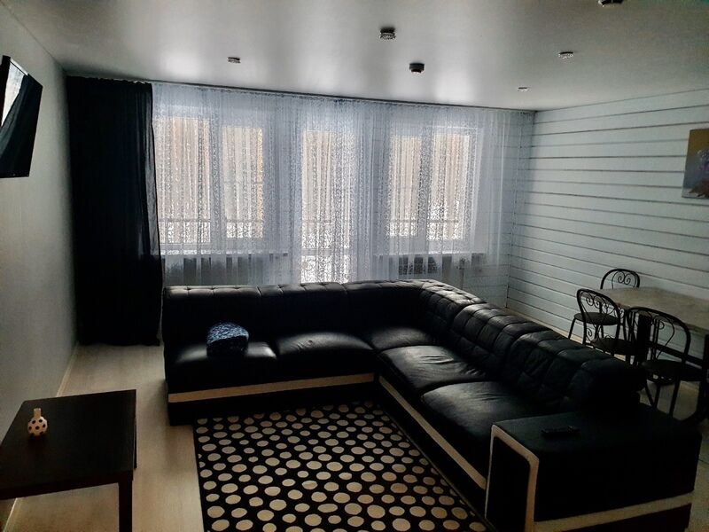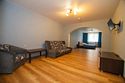 Гостиная с угловым диваном, стол, стулья, кухня, холодильник, микроволновая печь