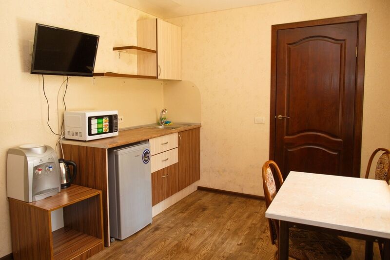 Двуспальная кровать, стол, стулья, кухня, холодильник, микроволновая печь, телевизор.