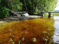 Вдоль берега 2-3 метра обрыв, есть спуск к воде. Дно пологое мелкое, 3 метра от берега песок дальше илистое. До 40 метров от берега глубина по грудь, дети могут купаться.