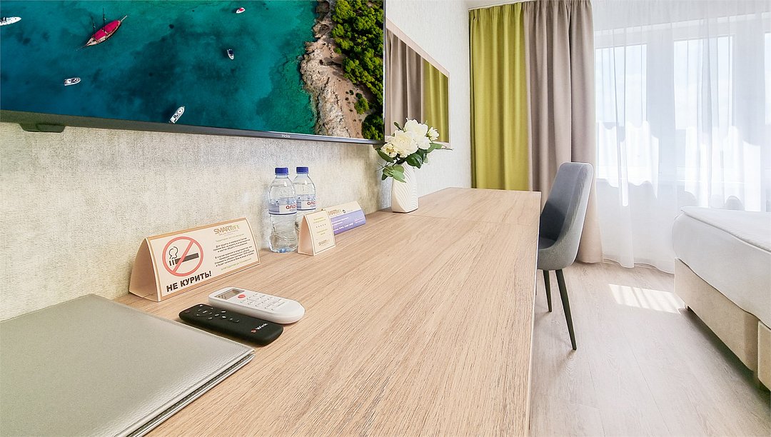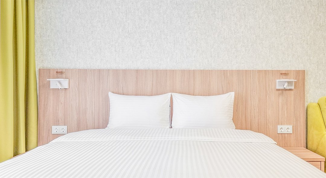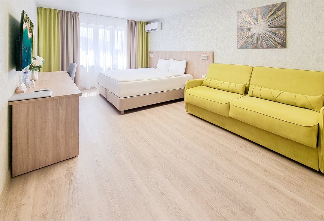 Апартаменты "SMART LIFE DELUXE", представляют собой просторный номер с двуспальной кроватью King size (или двумя односпальными, по запросу), удобнейшим диваном-кроватью. В апартаментах работает система "Умный дом", для комфортного отдыха гостей. Для путешествующих с детьми предоставляется детская кровать (по запросу). В номере, площадью 41 м2, имеется оборудованная всем необходимым кухня, балкон, гладильный комплекс, система кондиционирования.Услуги и удобства