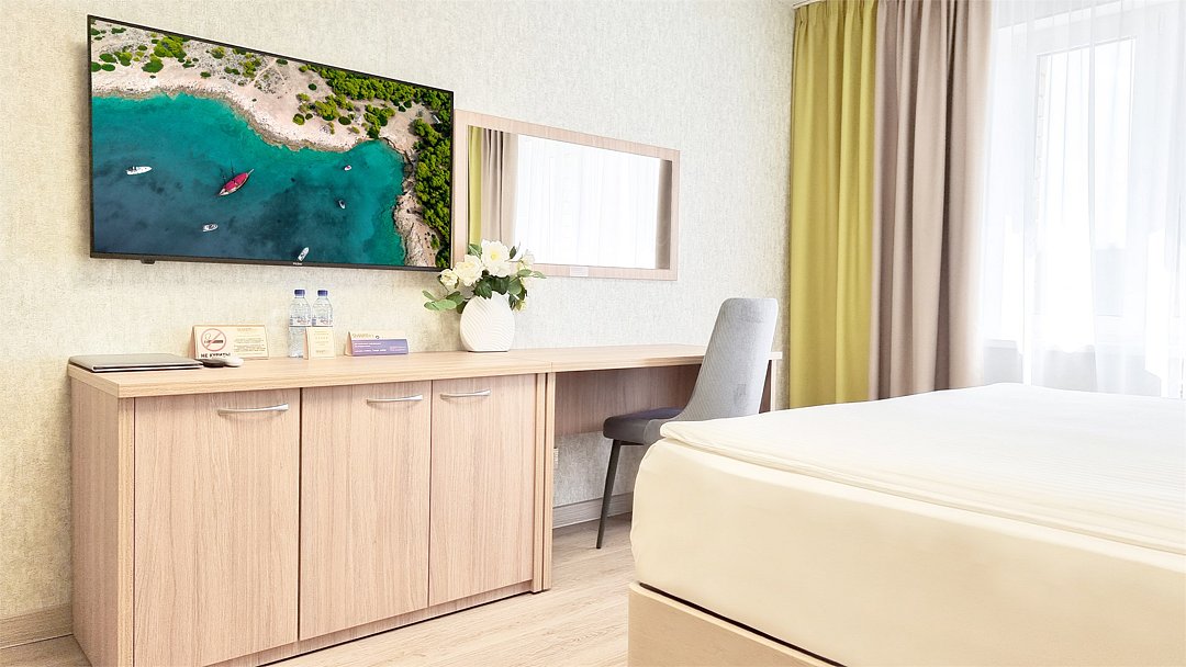 телевизор, интерактивное телевидение, Wi-Fi, холодильник, кондиционер, система климат-контроля, светильник, фен, система безопасности, электронные замки, микроволновая печь, утюг, ванная комната, душевая кабина, санузел, водонагреватель, банные полотенца, тапочки, гигиенические средства, косметические средства, двуспальная кровать, гладильная доска, тумбы, стулья, шкаф для одежды, вешалки, обеденный стол, багажная тумба, зеркало, чайный набор, набор посуды, сейф, минеральная вода, стиральная машина, чайник, унитаз, раковина, питьевая вода, обеденная зона, отопление, отдельный вход в номер, душ, вид на город, ламинат, высокие потолки, кухонная посуда, стаканы, столовые приборы, туалетный столик, стул, стол, туалетный столик, панорамные окна, сушилка для белья, цифровое тв, телевизор с плоским экраном, мини-холодильник, кухонный уголок, москитная сетка, гостиничная парфюмерия, телевизор со Smart TV, номер для некурящих, usb порт, рабочий стол, электронный консьерж 24/7, онлайн-регистрация до заезда, система умный дом, чайная станция, умная колонка, фумигатор, услуги прачечной (платно), вешалки-плечики, бутилированная вода, мини-бар (платно), мыло, затемняющая штора, зеркало в полный рост, самостоятельная регистрация, онлайн-регистрация, международная розетка, без питомцев, сенсорные панели для управление освещением, Android TVВ номере