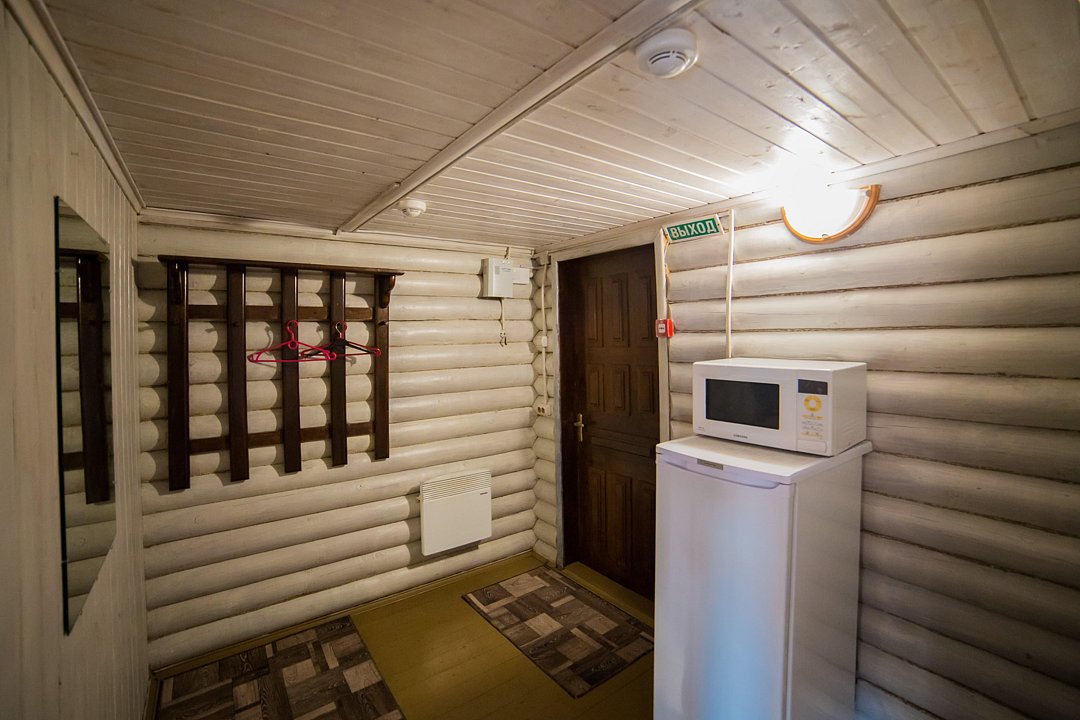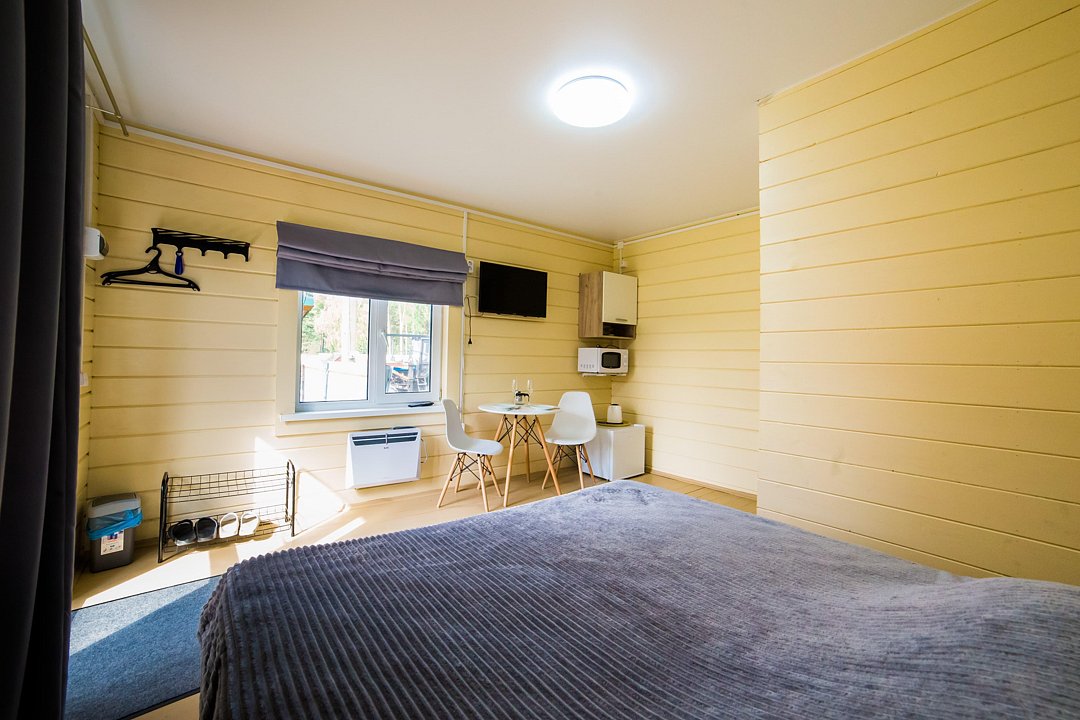 В номере имеется все необходимое для комфортного проживания: большая двуспальная кровать, санузел, телевизор, микроволновка, обеденный стол, посуда, электрический чайник, холодильник, электрический конвектор.