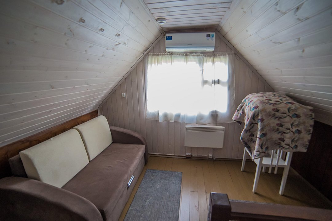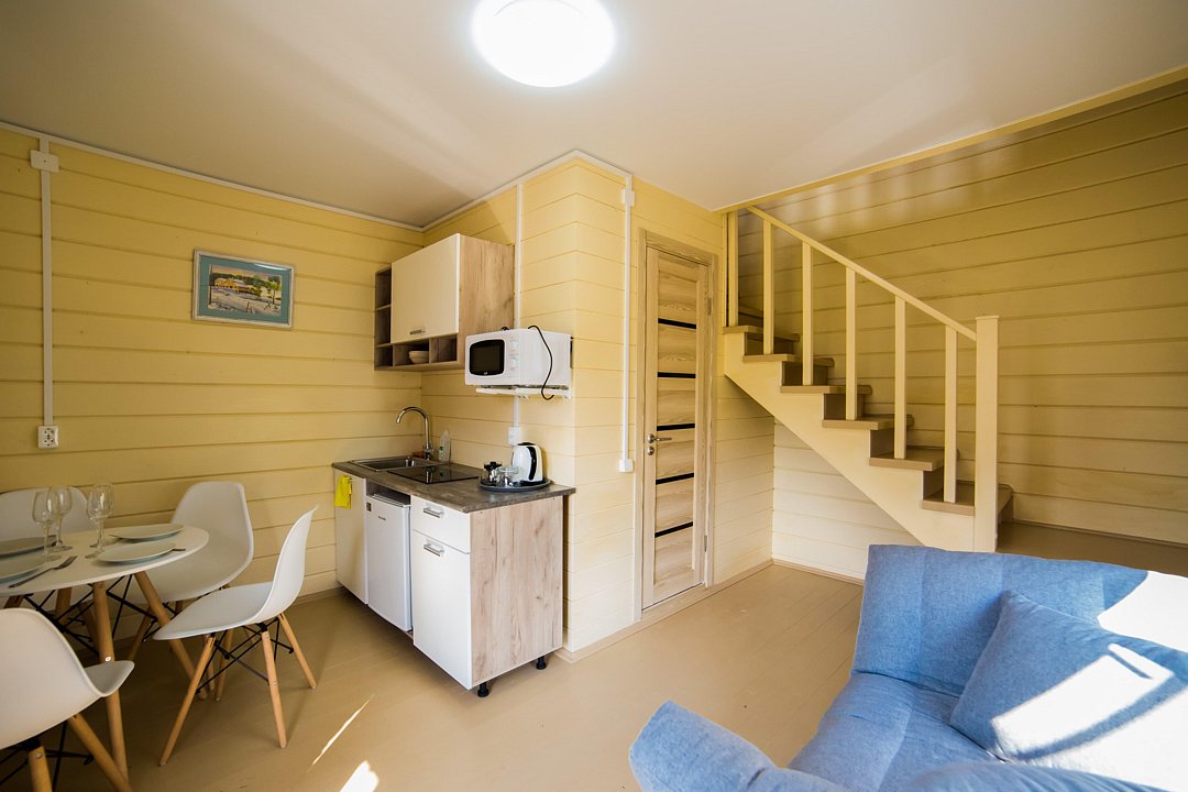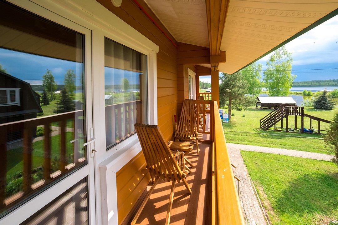 На 1м этаже - кухня с обеденной зоной, санузел, раскладная кушетка (доп. место), на 2м этаже - спальня с большой двуспальной кроватью, раскладное кресло (доп. место), балкон с видом на озеро.