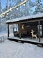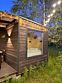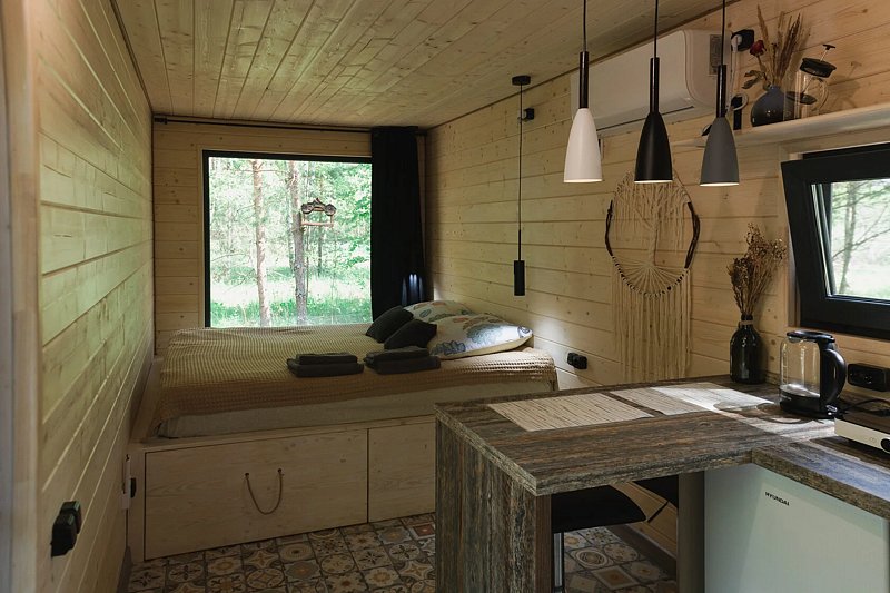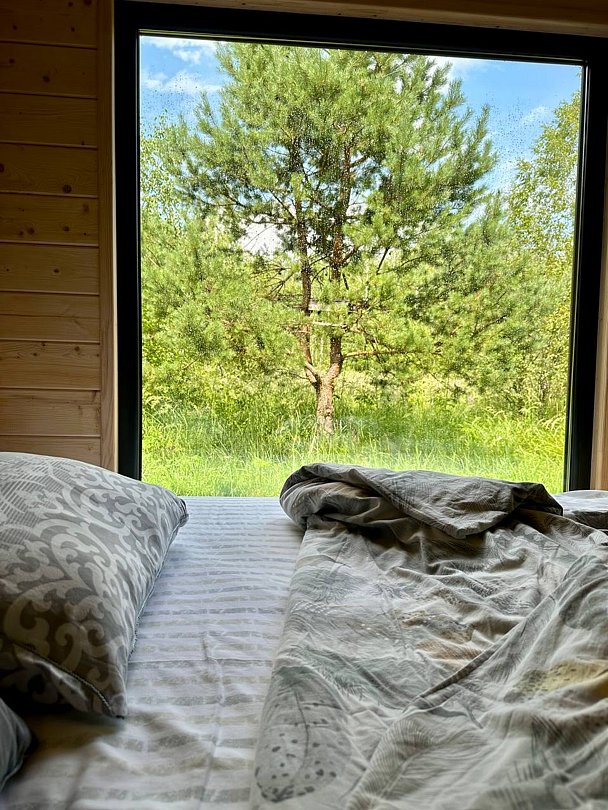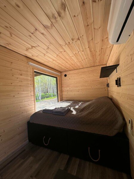 Лесной домик с панорамным окном и всеми удобствами. В проживание включена аренда собственной бани, стоящей рядом с домиком.