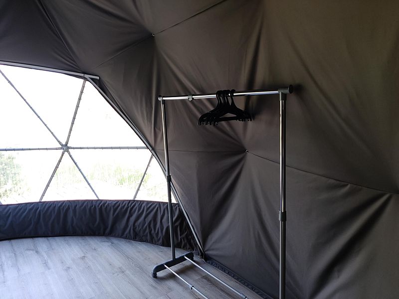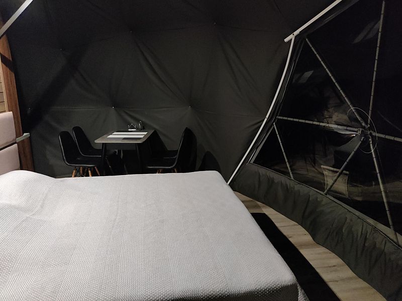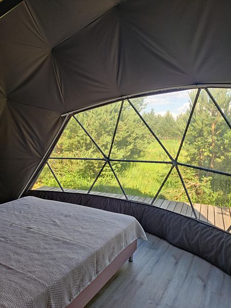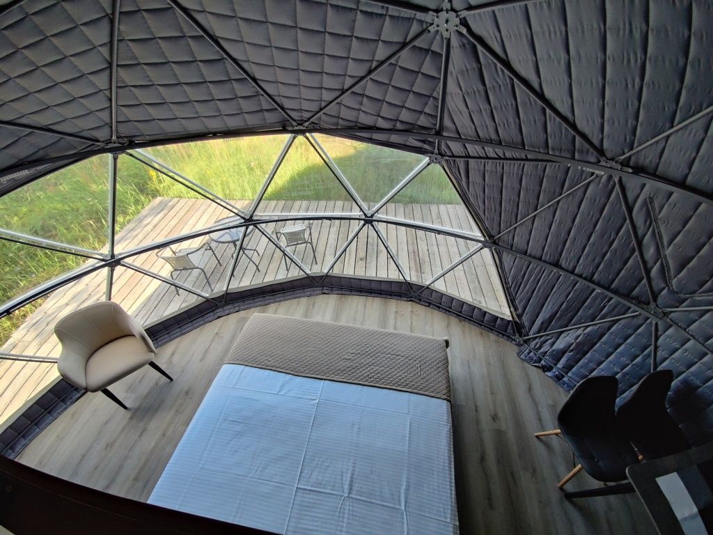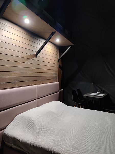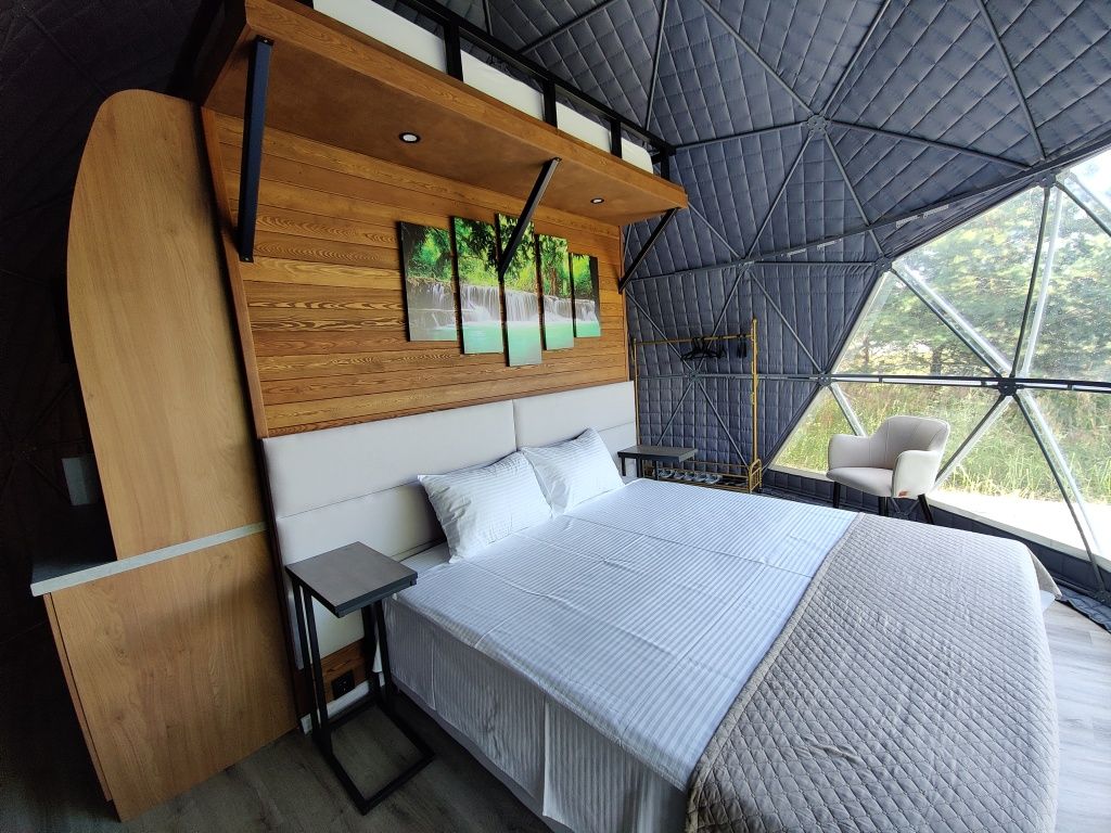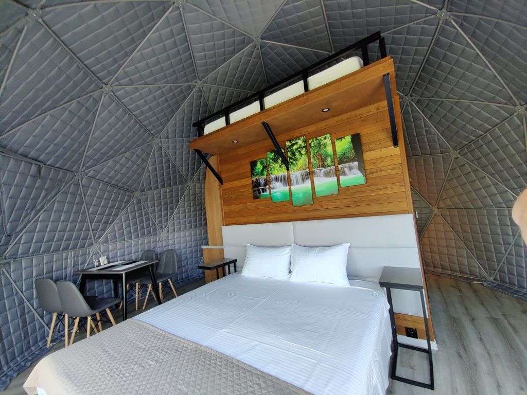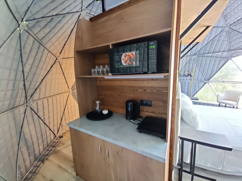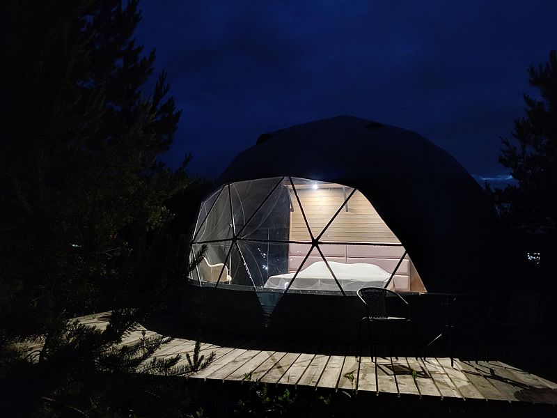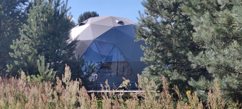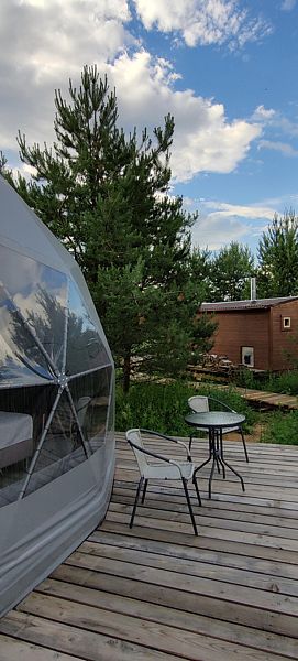 Расположиться гостям предлагается в комфортабельных геокуполах, оснащенных всем необходимым. В вашем распоряжении удобные кровати, кондиционер, обогреватель и бесплатный Wi-Fi. Собственная ванная комната оборудована новой сантехникой и туалетными принадлежностями. А с террасы можно полюбоваться лесом.