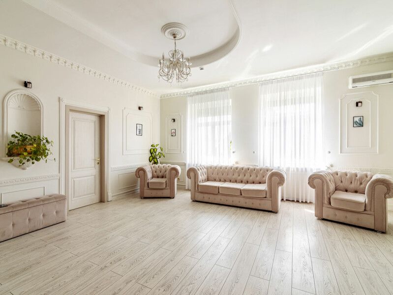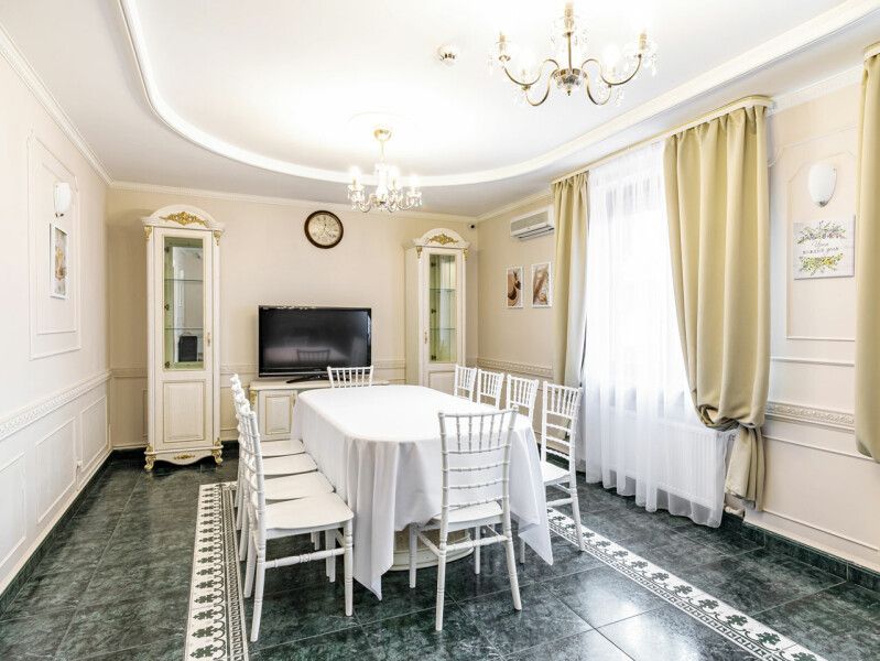 Большой банкетный зал площадью 100 квадратных метров вмещает до 60 человек. Светлый интерьер, панорамные окна с видом на сад, музыкальное оборудование, лазерная светомузыка, отдельная гардеробная и санузел. Зал находится отдельно от основного здания, при этом у него хорошая шумоизоляция – уставшие гости смогут отдохнуть в тишине в уютных спальнях коттеджа.