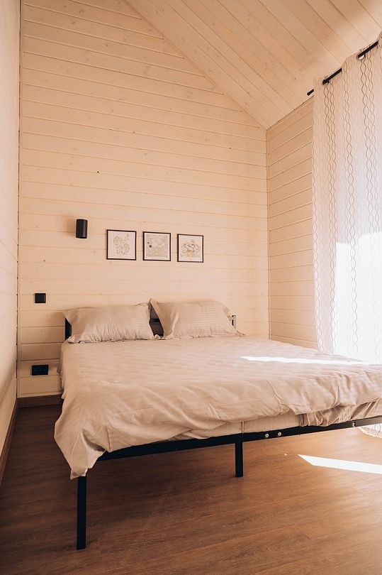 Гостевой домик с панорамными окнами, из которых открывается прекрасный вид на территорию глэмпинга, реку и лес. Есть отдельная спальня с двуспальной кроватью и балконом, мансардный этаж с двуспальной кроватью, кухня-гостиная с выходом на террасу. На террасе есть шезлонги и зонт.