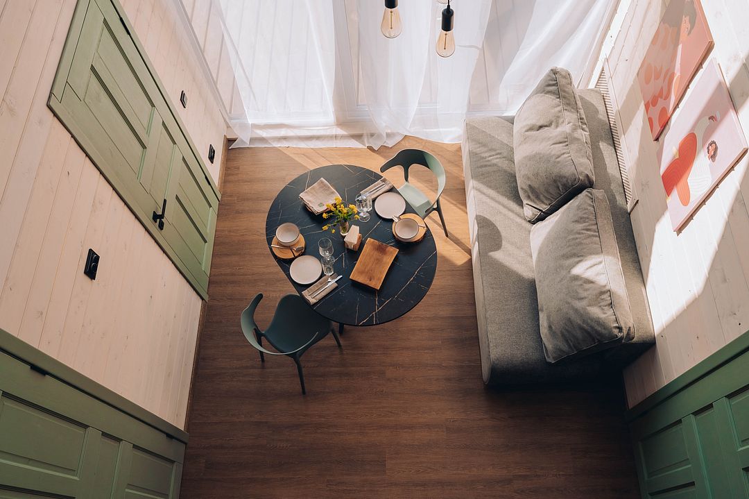 Просторные спальни с видом на лес и реку приглашают отдохнуть после насыщенного дня. Кухня-гостиная с современной техникой и удобной мебелью позволяет наслаждаться кулинарными изысками, не выходя из дома. Террасы с шезлонгами приглашают полюбоваться красотой природы и насладиться ее дарами.