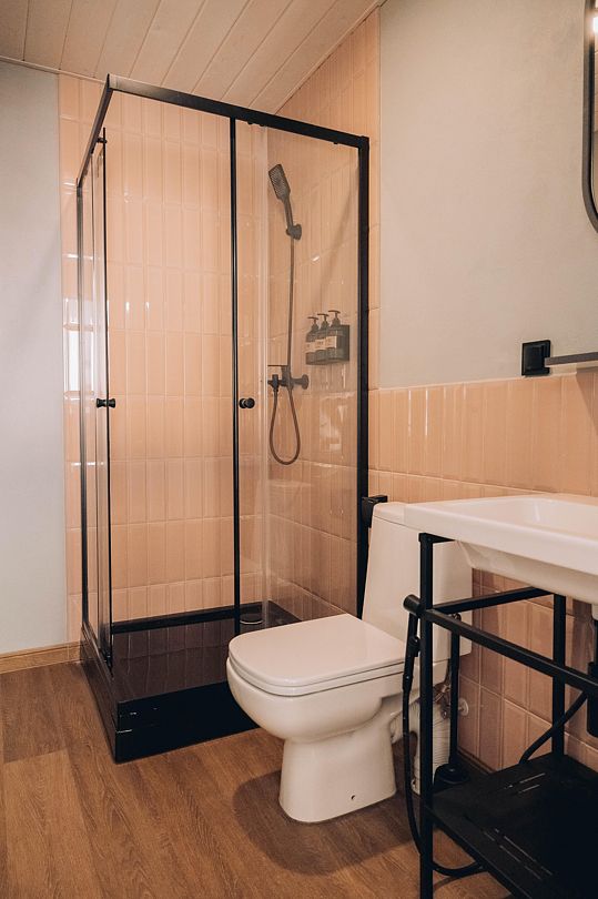 Также в домике есть санузел с душевой кабиной и отдельная гардеробная комната с зеркалом.