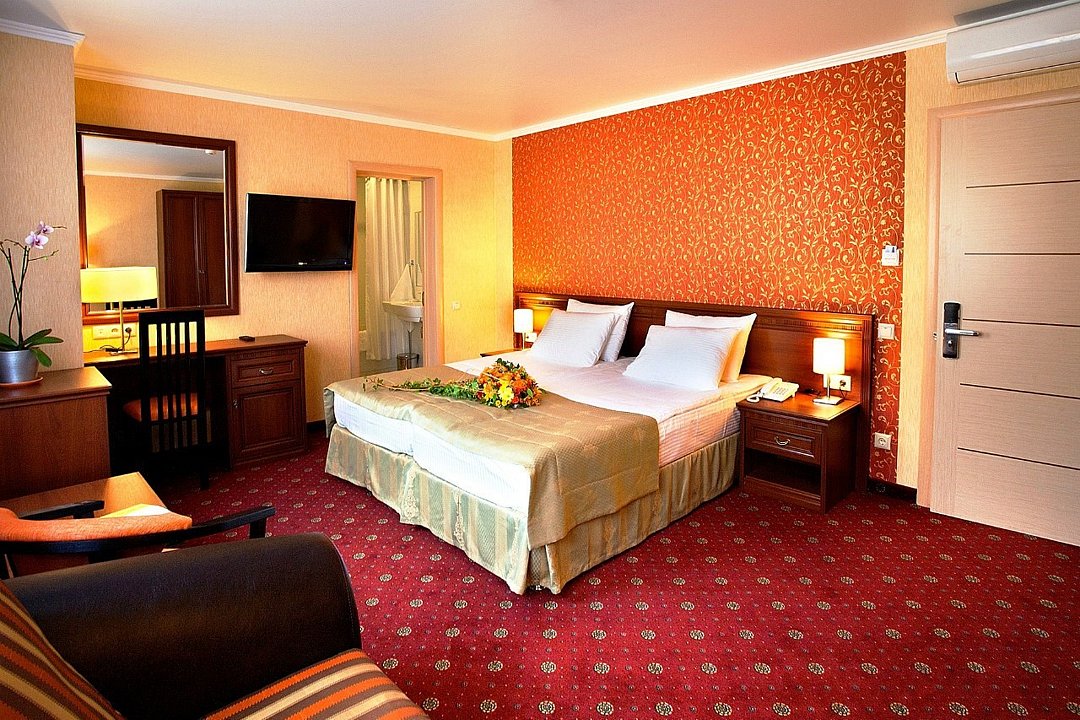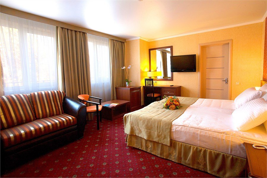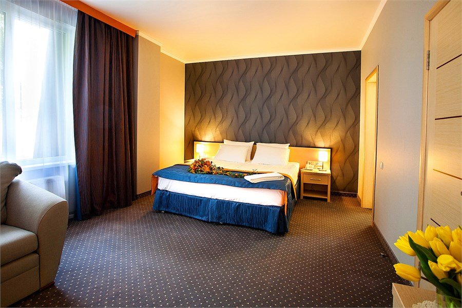 Двухкомнатный номер высшей категории, площадью 41 кв.м.Спальня с французской кроватью королевского размера и мягкой зоной для отдыха. Гостиная с мягкой зоной для отдыха, рабочим столом. Комплимент при заезде. Оснащение номера Бесплатный доступ в Интернет Индивидуально кодируемые электронные замки Сейф Кондиционер Укомплектованный мини-бар Телефонная связь Телевидение с новостными и развлекательными каналами Удобная рабочая зона со столом и креслом Фен в ванной комнатеУслуги и удобства